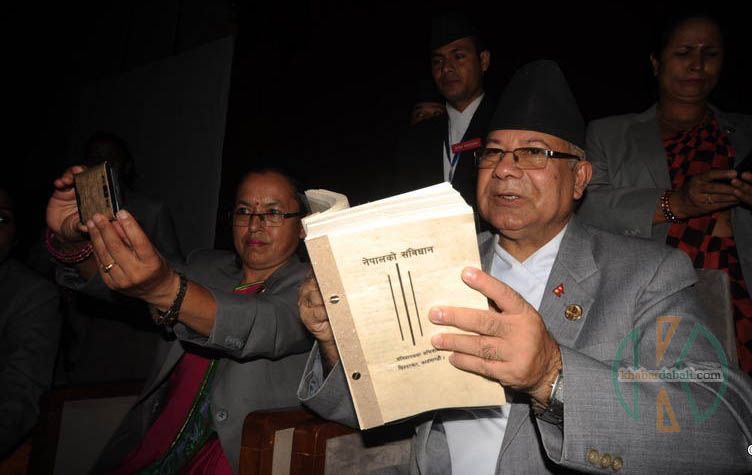 काठमाडौं । बिहिबार संविधानमा भएको भाषिक अशुद्धता सच्याइसकेपछि  शुक्रबार संविधानसभाका सभासदहरुलाई हस्ताक्षरका लागि नेपालको नयाँ संविधान दिइएको । नेपाली कागजमा प्रिन्ट भएको नेपालको नयाँ संविधानमा सभासदहरुले हस्ताक्षर गर्ने कार्यक्रम शुक्रबार दिउसो ३ बजे सकिने छ भने संविधान आएको खुशियालीमा सभासद तथा नेताहरुले संविधानसँग सेल्फी खिचेका छन् । हेरौं केही फोटाहरु- \"constitution2\" \"constitution3\" \"constitution7\"   \"constitution8\"