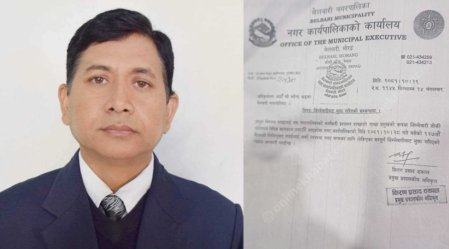 ‘प्रस्तुत विषयमा तपाईंलाई यस नगरपालिकाको कर्मचारी प्रशासन शाखाको शाखा प्रमुखको रूपमा जिम्मेवारी तोकी पालिकाले विभिन्न कामकाज लगाउँदै आएकोमा नगर कार्यपालिकाको मिति २०८१र१०र२८ गते बसेको १२७ औं बैठकको निर्णयानुसार तपाईंलाई अर्को व्यवस्था नभएसम्मका लागि तोकिएका सम्पूर्ण जिम्मेवारीबाट मुक्त गरिएको व्यहोरा जानकारी गराईन्छ’, खड्कालाई दिइएको पत्रमा लेखिएको छ । पत्र पठाएपछि खड्का कार्यालयमा हाजिर भएका छैनन् ।