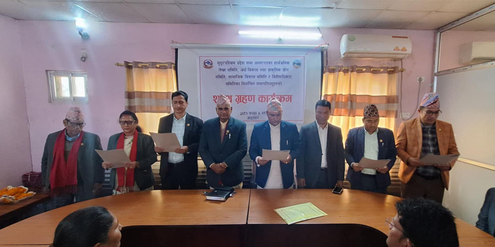 कैलाली । सुदूरपश्चिम प्रदेश सभा अन्तर्गतको विषयगत समितिका नवनिर्वाचित सभापतिहरुले पद तथा गोपनियताको सपथ ग्रहण गरेका छन् । प्रदेश सभा सचिवालयमा आयोजित समारोहमा उनिहरुले सपथ ग्रहण गरे ।