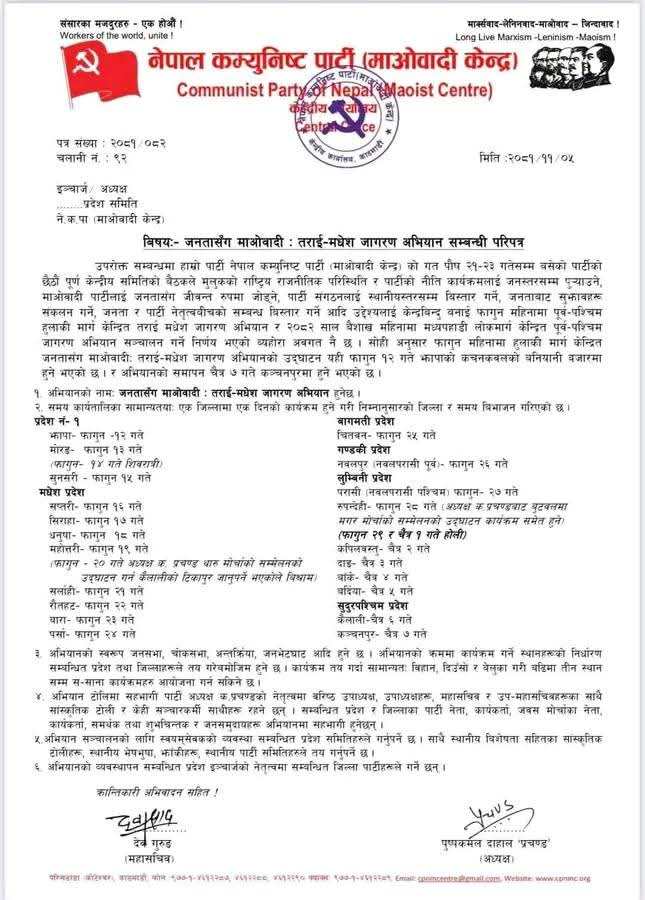 अभियानको उद्घाटन यही फागुन १२ गते झापाको कचनकवलको बनियानी बजारमा हुने र समापन चैत्र ७ गते कञ्चनपुरमा हुने परिपत्रमा उल्लेख गरिएकाे छ । अभियानको नाम: जनतासँग माओवादी, तराई मधेस जागरण अभियान राखेको छ । समय कार्यतालिका सामान्यतया: एक जिल्लामा एक दिनको कार्यक्रम हुने गरी विभाजन गरिएको छ । फागुन २० गते पार्टी अध्यक्ष पुष्पकमल दाहाल प्रचण्ड थारु मोर्चाको सम्मेलनको उद्घाटन गर्न कैलालीको टिकापुर जानुपर्ने भएकाले त्यो दिनको कार्यक्रम स्थगित गरिएको छ ।