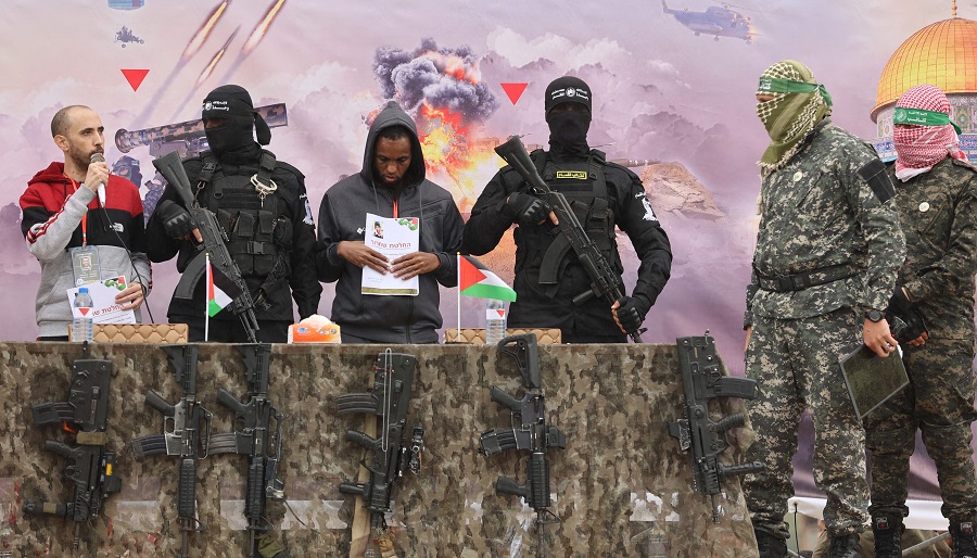 लडाकूहरूले शनिबार रिहा भएका ताल शोहम र एवेरु मेन्गिस्टुलाई दक्षिणी गाजाको राफाको एक मञ्चमा लगीसोहमलाई कालो पहिरनमा सजिएका सशस्त्र र नकाबपोश लडाकुहरूको उपस्थिति रहेको भेलालाई सम्बोधन गर्न लगाइयो र त्यसपछि दुवै जनालाई रेडक्रसको जिम्मा लगाइएको थियो ।