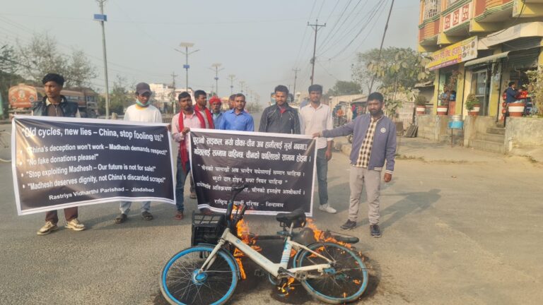चिनियाँ सहयोगको नाममा पुरानो र कमसल साइकल वितरण गरिएको भन्दै राष्ट्रिय विद्यार्थी परिषद्ले विद्यालयमा विरतरण गरिएको चाइनिज साइकल जलाएको छ । प्रदर्शनकारीहरूले ‘चीनको चलाखी अब चल्दैन, मधेसीलाई अपहेलित गर्न पाइदैन, मधेशलाई सम्मान चाहिन्छ’ जस्ता नाराबाजी गरेका थिए ।