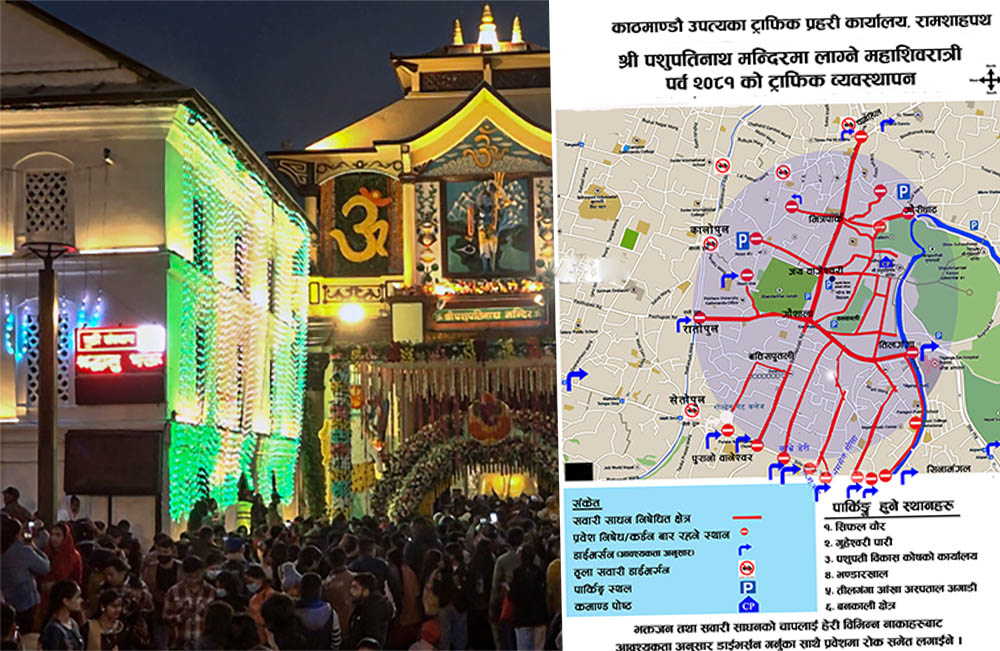काठमाडौं । महाशिवरात्री पर्वको अवसरमा पशुपतिनाथ क्षेत्रमा हुने भिडभाडलाई सुरक्षित एवम् व्यवस्थित गर्न काठमाडौं उपत्यका ट्राफिक प्रहरी कार्यालयले सुरक्षा योजना तयार पारेको छ ।