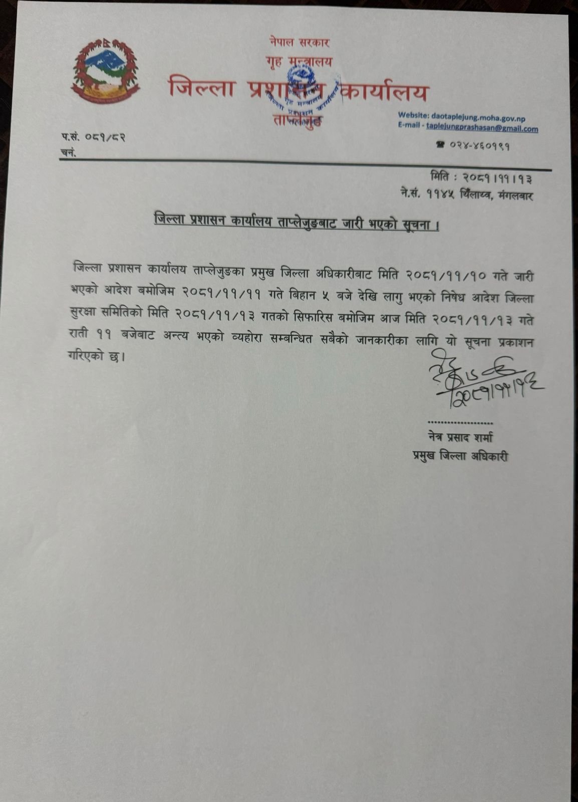 ताप्लेजुङ । ताप्लेजुङकाे सदरमुकाम फुङ्लिङमामा लागेकाे निषेधाज्ञा आज राती ११ वजेदेखि अन्त्य हुने भएकाे छ । जिल्ला प्रशासन कार्यालय ताप्लेजुङले गत ११ गतेदेखि लागू गरेको निषेधाज्ञा आज राती ११ बजेदेखि अन्त्य गर्ने सूचना जारी गरेको हाे ।