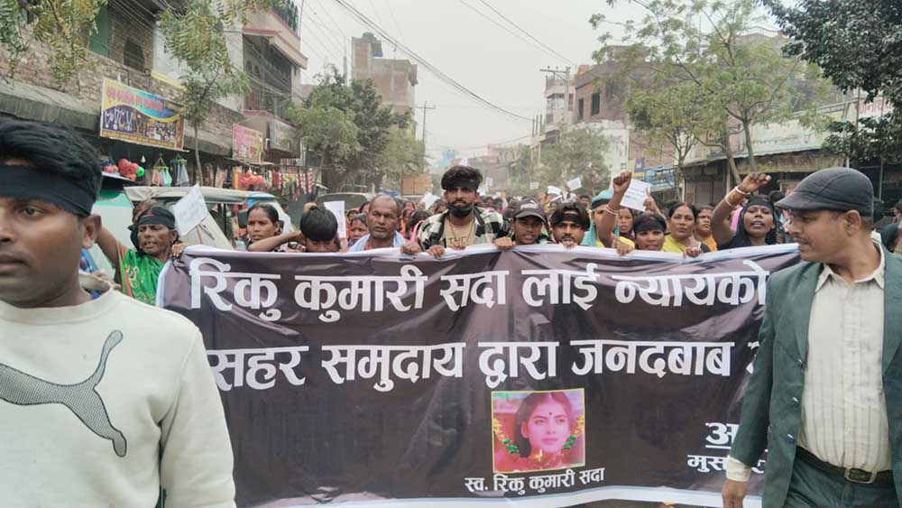 सिरहा । सिरहामा बलात्कार भएपछि मृत्यु भएकी नवराजपुर–१ भगवतीपुरकी रिङ्कु सदायको परिवारलाई न्याय दिलाउन दबाब दिन मुसहर समुदायद्वारा लहानमा प्रदर्शन गरिएको छ ।