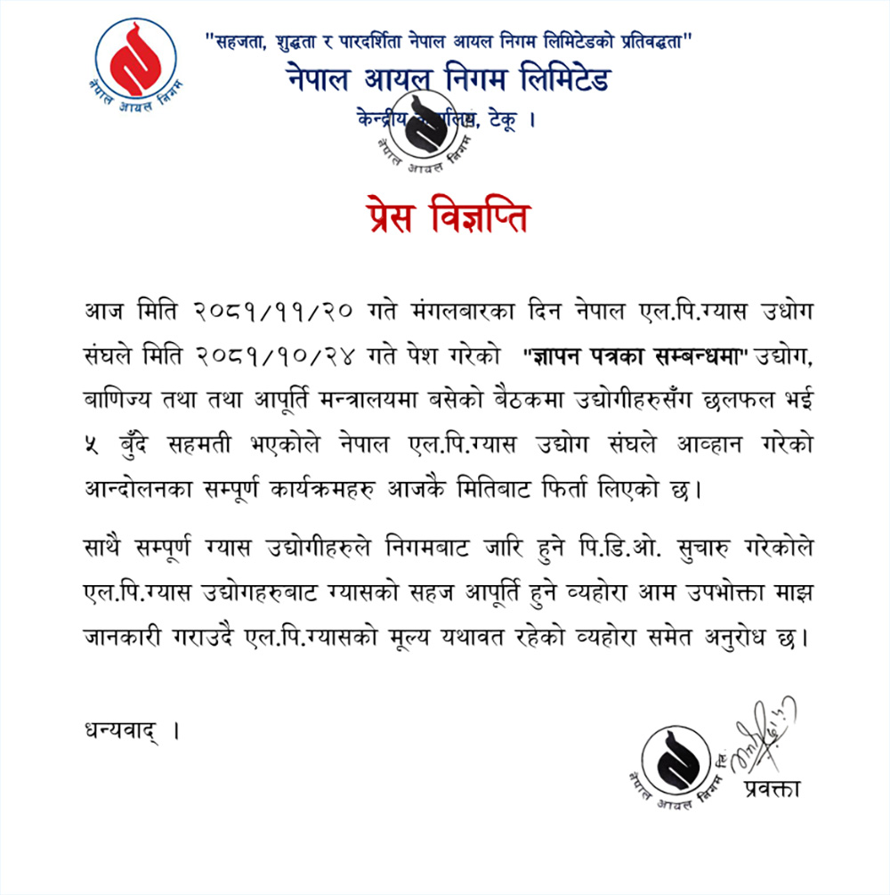 मंगलबार नेपाल एलपी ग्यास उद्योग संघसँग भएको सरकारको सहमतिपछि आन्दोलनका कार्यक्रम फिर्ता भएको जनाउदै ग्यास उद्योगहरुबाट अब ग्यास सहज उपलब्ध हुने बताएको हो । सती निगमले ग्यासको मुल्य यथावत रहने बताएको छ ।