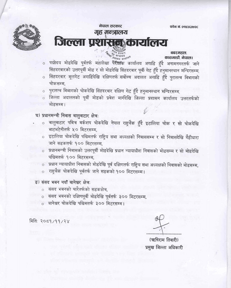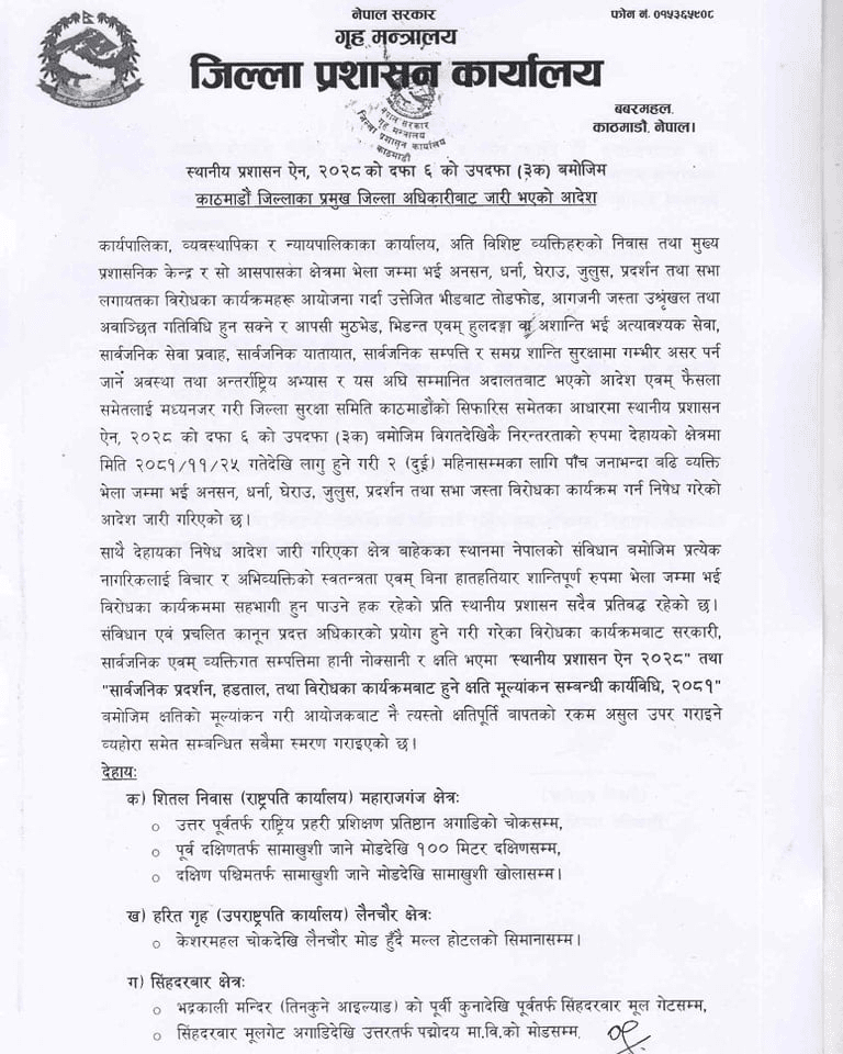 जिल्ला प्रशासन कार्यालयले फागुन २५ गते आइतबारदेखि लागू हुने गरी भीभीआइपी र भीआइपीहरुको ओहोरदोहोर हुने, वासस्थान लगायतका क्षेत्रमा २ महिने निषेधाज्ञा जारी गरेको हो । जसमा राष्ट्रपति र उपराष्ट्रपति कार्यालय वरपर, सिंहदरबार, प्रधानमन्त्री निवास बालुवाटार र संसद् भवन वरपर निषेधित क्षेत्रका रूपमा परेका छन् ।