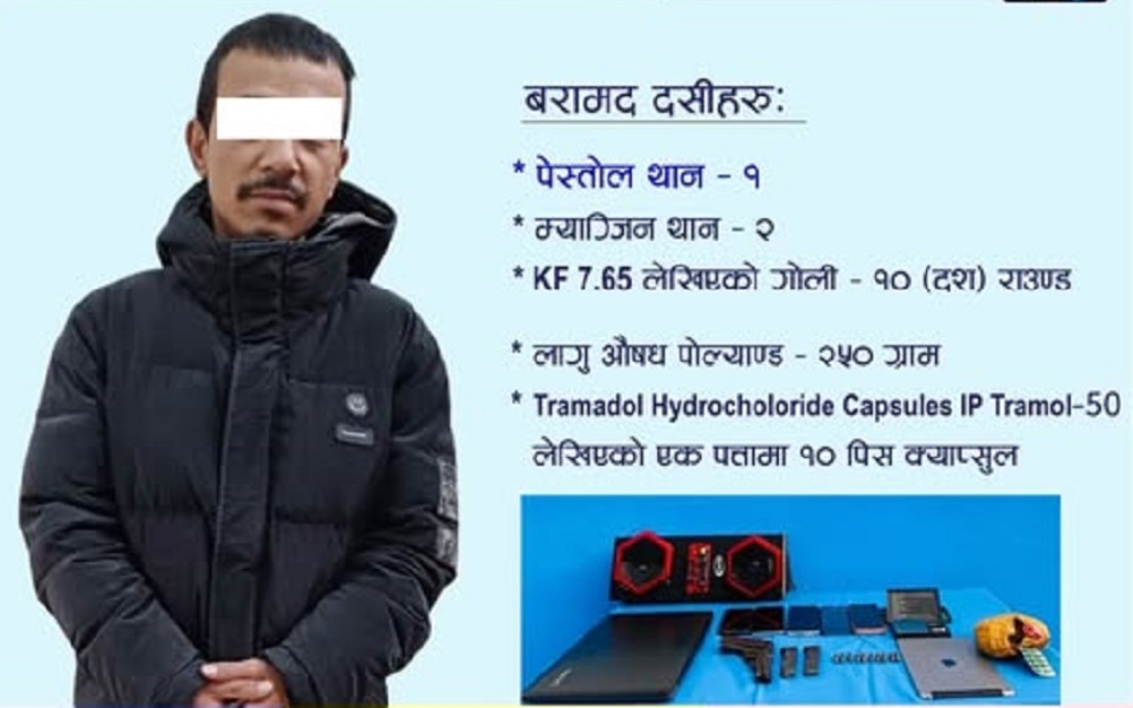 काठमाडाैं । काठमाडौंबाट १ थान पेस्तोल र लागु औषध सहित १ जना पक्राउ परेका छन् । पक्राउ पर्नेमा काठमाडौं गोकर्णेश्वर नगरपालिका वडा नं २ भाड गाउँ स्थित मिरा तामाङको घरमा डेरा गरी बस्ने सुदन जोशी रहेका छन् ।