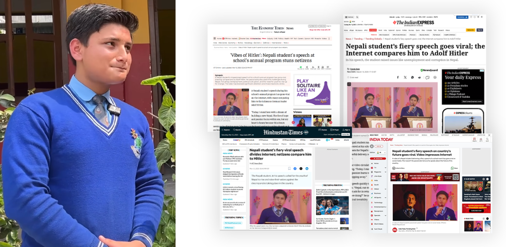 भारतको आर्थिक अखबार ‘द इकोनमिक टाइम्स’ले नेपाली विद्यार्थीले स्कुलमा राखेको मन्तव्यको भिडियो भाइरल भएको भन्दै लेखेको छ । त्यसमा उनको भाषणलाई धेरैले जर्मनका क्रुर शासक एडल्फ हिटलसँग तुलना गरेको उल्लेख गरिएको छ ।