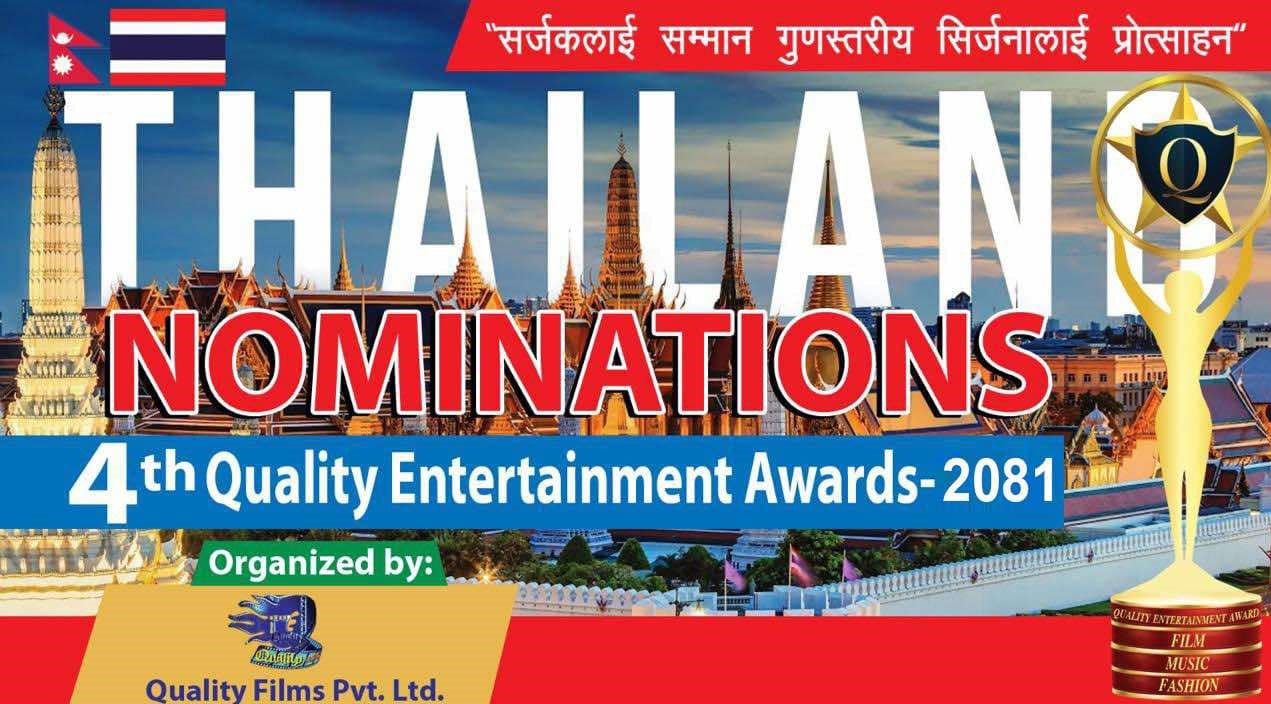 काठमाडौं । चौथो क्वालिटी इन्टरटेनमेन्ट अवार्ड २०८१ को यस पटक थाइल्यान्डमा हुने भएको छ । यो अवार्ड गत वर्ष मलेशियामा आयोजना गरिएको थियो । यसैबिच आयोजक क्वालिटी फिल्मस् प्रा.लि.ले यस पटक अवार्डमा सहभागी भएका विभिन्न २७ विधाको मनोनयन सूची आज सार्वजनिक गरेको छ ।