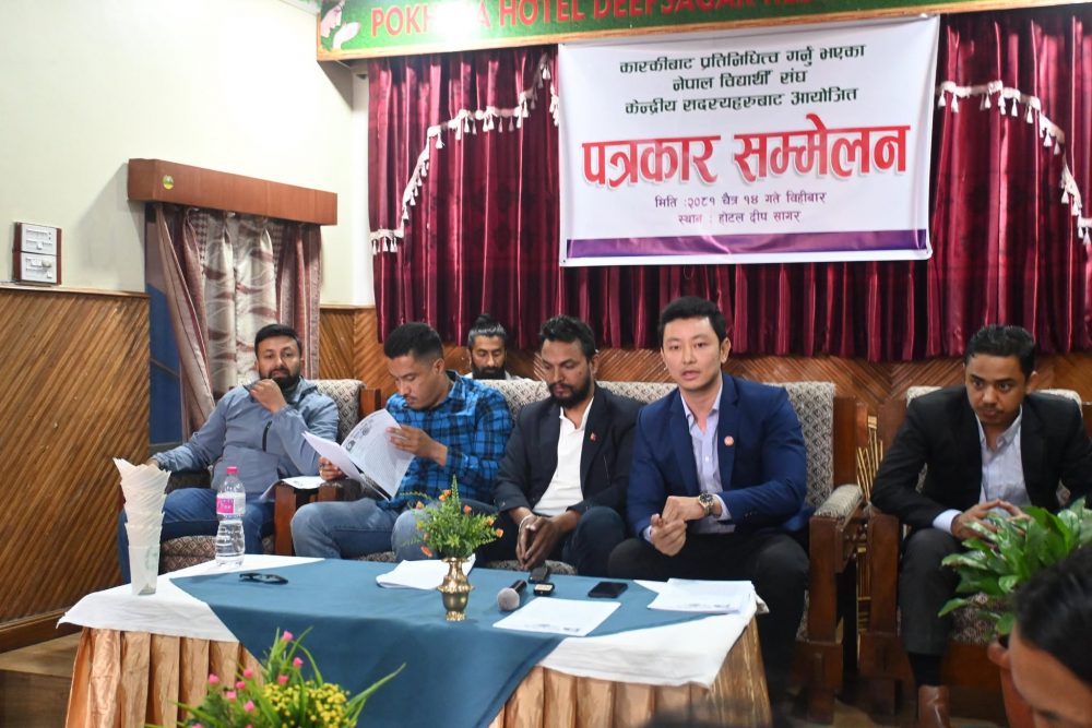 पोखरा । नेपाल विद्यार्थी संघका ११ केन्द्रीय सदस्यले नेपाली कांग्रेस कास्की सभापति किशोरदत्त बराललाई कारबाहीको माग गरेका छन् ।