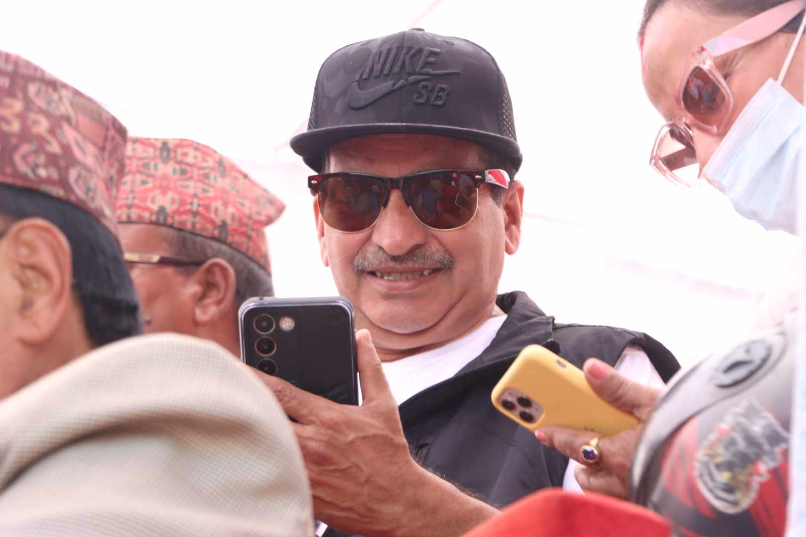 कालो टोपी र कालो चस्मामा ठाटिएका उनी हातमा मोबाइलको स्क्रिनमा हेर्दै मुस्कुराइरहेका छन्। उनी नेपालका चर्चित हास्य कलाकारमा पर्छन्।