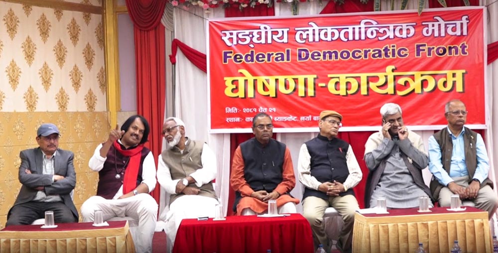 काठमाडौं । तराई–मधेस केन्द्रित सात राजनीतिक दलले ‘सङ्घीय लोकतान्त्रिक मोर्चा’ घोषणा गरेका छन् । संविधान संशोधन, सङ्घीय लोकतान्त्रिक गणतन्त्रको रक्षा, सुशासन प्रवर्द्धनलगायत उद्देश्यसहित आज एक कार्यक्रमबीच मोर्चा घोषणा गरिएको हो ।