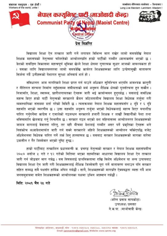माओवादीले सोमबार विज्ञप्तिमार्फत आन्दोलनरत शिक्षकका मागप्रति ऐक्यबद्धता जनाउँदै आम नागरिकलाई आन्दोलनको पक्षमा उभिन आह्वान गरेको हो ।