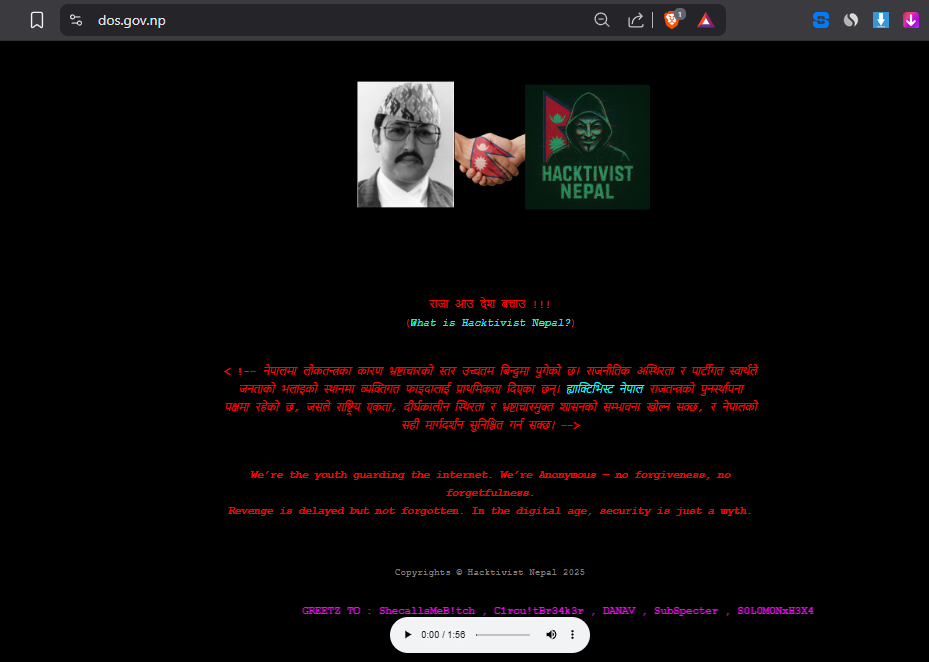 काठमाडौं । आफूलाई ‘ह्याक्टिभिस्ट नेपाल’ नामले चिनाउने एक ह्याकर समूहले सरकारी वेबसाइटहरूमा आक्रमण तीव्र बनाएको छ । पछिल्लो पटक यस समूहले नापी विभागको वेबसाइट (dos.gov.np) ह्याक गर्दै त्यसमा स्वर्गीय राजा विरेन्द्रको फोटो र ‘राजा आऊ, देश बचाऊ’ भन्ने नारा लेखेको छ ।
