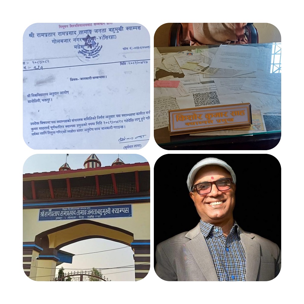 तर, क्याम्पस प्रमुख बनाइएका मनोज साह भने बेखबर छन्। उनी भन्छन्, ‘यो बिषयमा मलाई केही जानकारी छैन्। मलाई कसैले औपचारिक अनौपचारिक कुनैपनि रुपमा मैले जानकारी पाएको छैन्। क्याम्पस प्रमुख अहिले पनि किशोर साहजी नै हुनुहुन्छ ।’