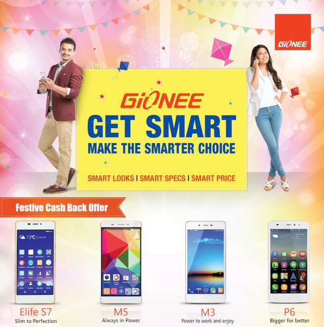 \"Gionee-Picकाठमाडाैं  । टेलिकम्युनिकेसन सामग्री निर्माणमा अग्रपङ्क्तिमा रहेको कम्पनी जियोनीले “गेट स्मार्ट” दशैँ तिहार अफरबजारमा ल्याएको छ । यस अफर अन्तर्गत, यो दशैँ तिहार जियोनीले आफ्ना केहि उत्कृष्ट मोडेलमा क्यास ब्याक अफरको व्यवस्था गरेको छ। ग्राहकहरुले जियोनीका ४ उत्कृष्ट मोडेल – इलाइफ एस ७, जियोनीको सबैभन्दा नयाँ र एक मात्र डुअल ब्याट्री फोन ( म्याराथन एम ५, म्याराथन एम ३, र पायोनियर पि ६ मा क्यास ब्याक अफर प्राप्त गर्नेछन् । क्यास ब्याक पायोनियर पि ६ मा रु. १४०० देखि इलाइफ एस ७ मा रु. ३००० सम्म उपलब्ध हुनेछ । यसको साथसाथै जियोनीले २ नयाँ मोडेल – पायोनियर पि ३ एस र एफ १०३ पनि रु. ८,९९९ र रु. १५,९९९ को आगमन मूल्यमा ल्याएको छ । जियोनीले भर्खरै मात्र नेपालमा आफ्नो पहिलो वर्ष सफलताका साथ पार गरेको छ र ग्राहकवर्गको उत्साहि प्रतिक्रियाबाट जियोनी अत्यन्त खुशी छ। जियोनीको “गेट स्मार्ट” अफर असोज ५ देखि कार्तिक ३० गतेसम्म बजारमा उपलब्ध हुनेछ ।