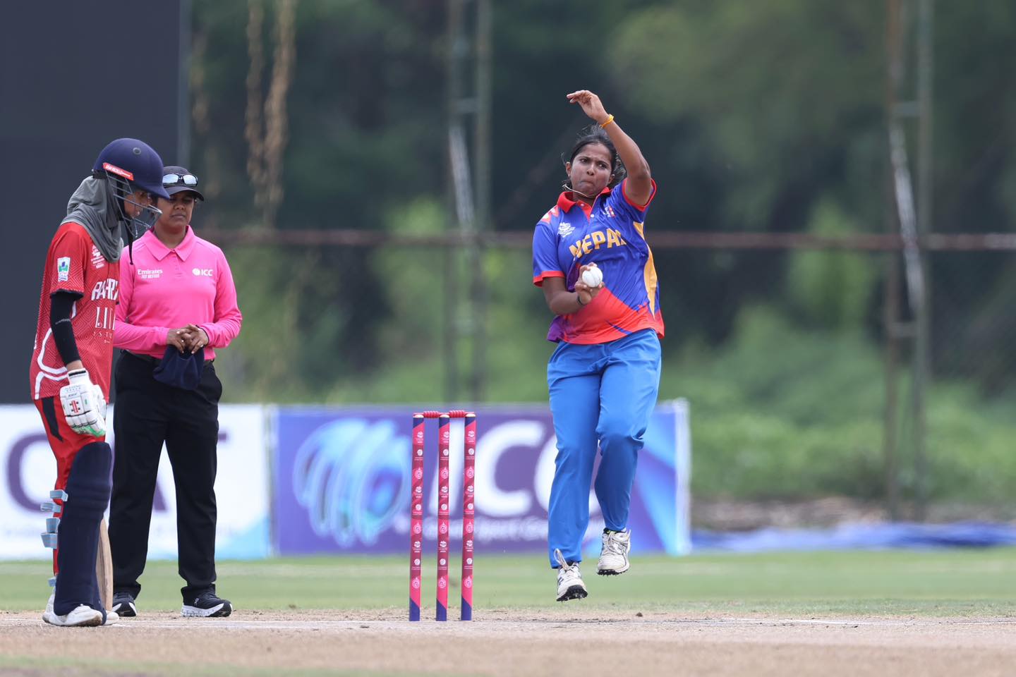 थारांगा गजनायकेले ३ तथा जेनेब फाजिलले २ रन जोडिन् । नेपालका लागि एक मात्र विकेट पूजा महतोले लिइन् ।
