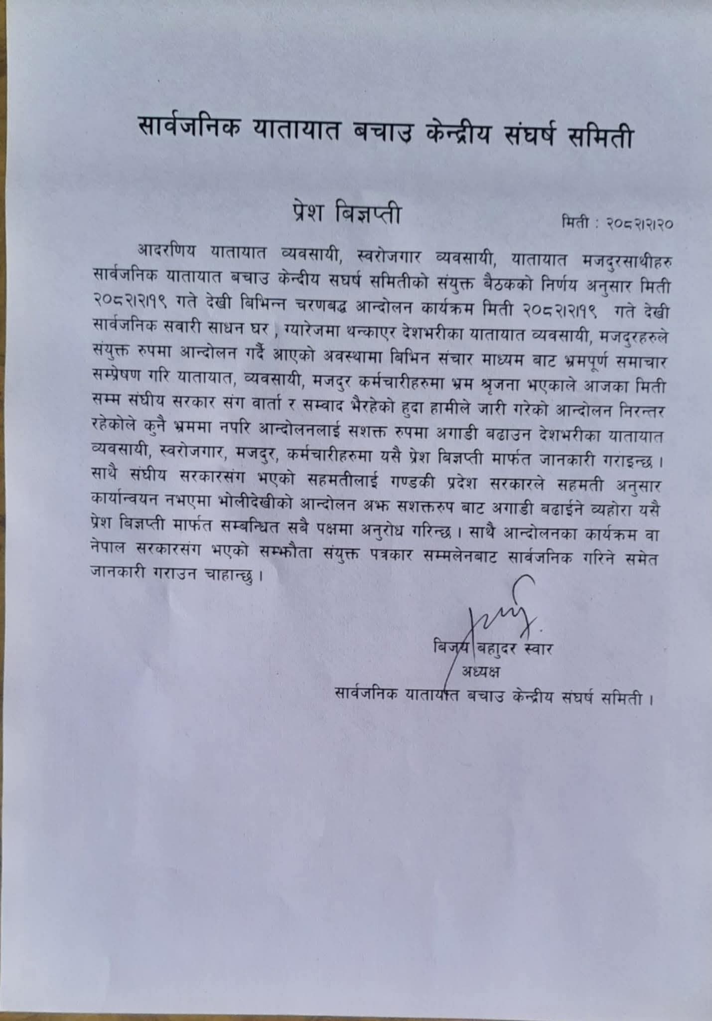 गण्डकी प्रदेश सरकारले ल्याएको कानुनलाई फिर्ता लिन अस्वीकार गरेकाले आन्दोनललाई सशक्त बनाउन लागिएको सार्वजनिक यातायात बचाउ केन्द्रीय संघर्ष समितिको अध्यक्ष विजयकुमार स्वाँरले प्रेस बिज्ञप्तिमार्फत जनाएका छन् ।