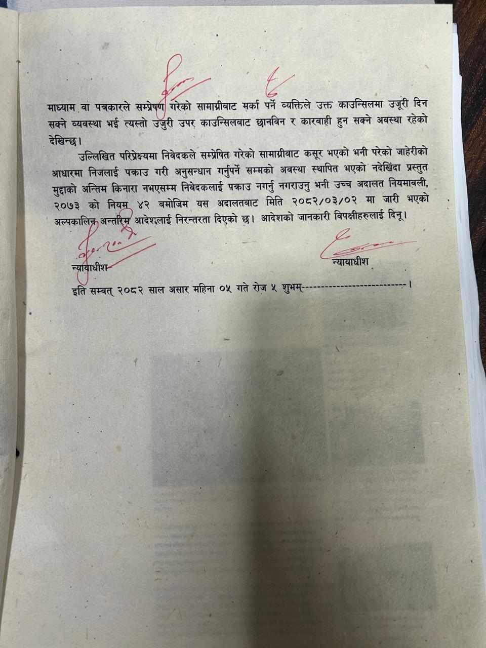 सञ्चारमाध्याम वा पत्रकारले सम्प्रेषण गरेको सामाग्रीबाट मर्का पर्ने व्यक्तिले काउन्सिलमा उजूरी दिनसक्ने तथा उजुरीउपर काउन्सिलले छानविन र कारबाही गर्न सक्ने व्यवस्था स्मरण गराउँदै आदेशमा भनिएको छ, ‘निजलाई पक्राउ गरी अनुसन्धान गर्नुपर्नेसम्मको अवस्था स्थापित भएको नदेखिँदा प्रस्तुत मुद्दाको अन्तिम किनारा नभएसम्म निवेदकलाई पक्राउ नगर्नु नगराउनु ।’