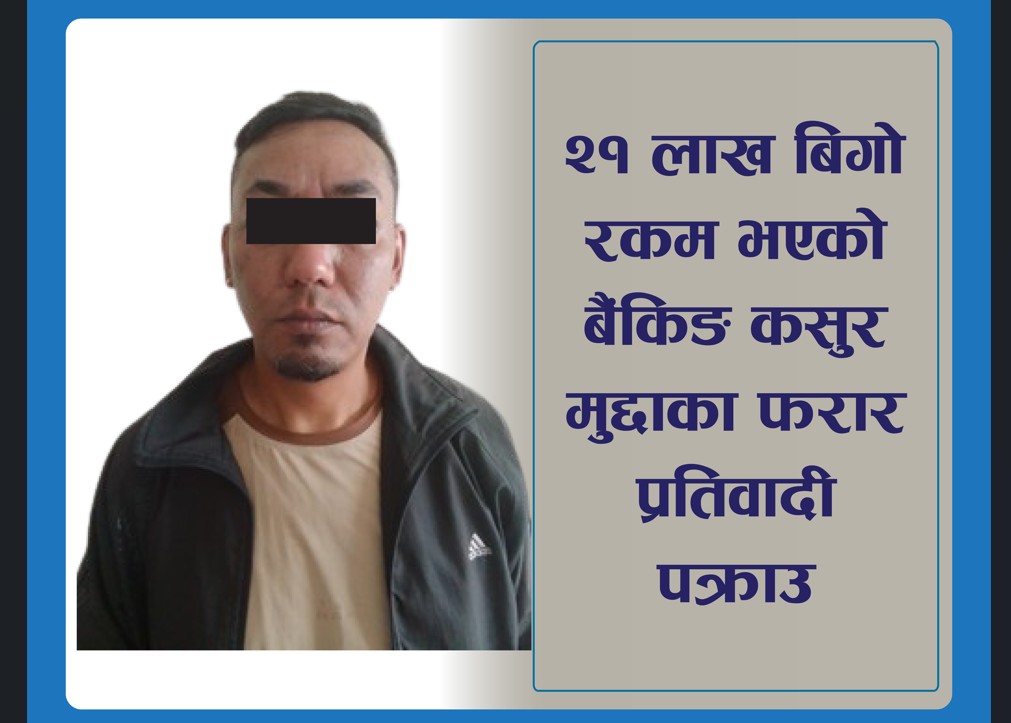 काठमाडौं। जिल्ला प्रहरी परिसर, काठमाडौंले २१ लाख रुपियाँ बिगो र दुई वर्ष कैद सजाय तोकिएको बैंकिङ कसुर मुद्दाका फरार प्रतिवादीलाई प्रहरीले काठमाडौंबाट पक्राउ गरेको छ ।