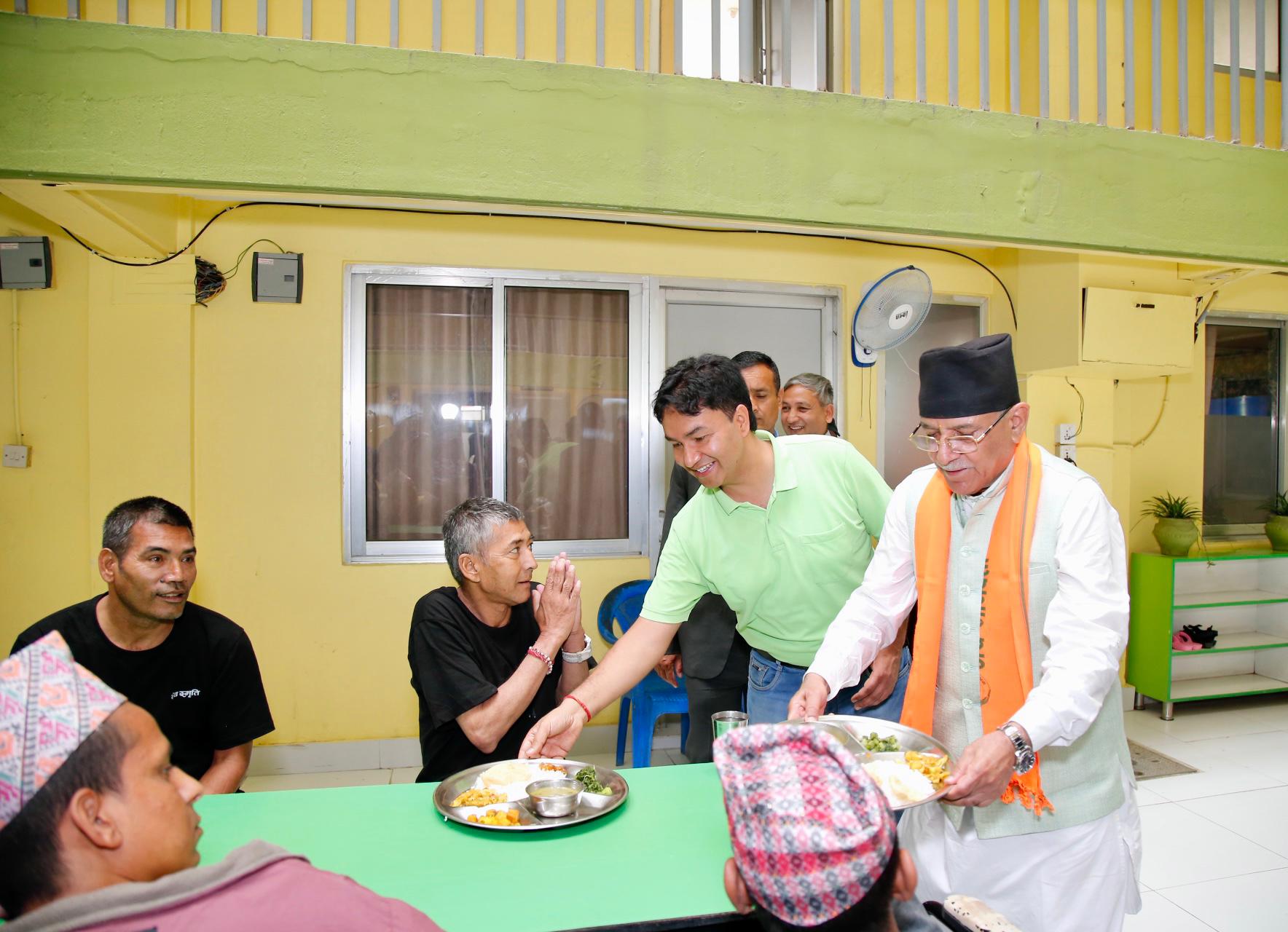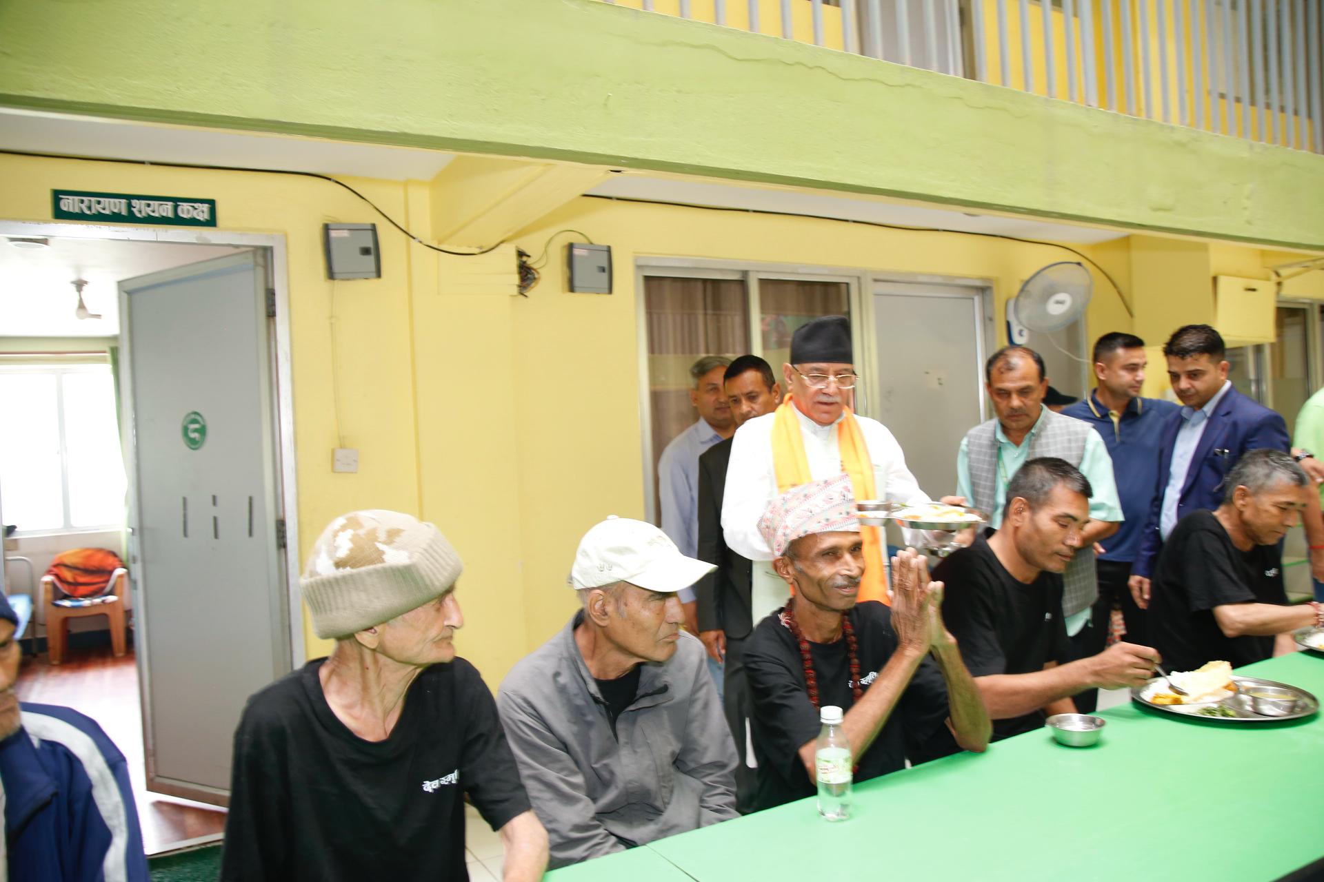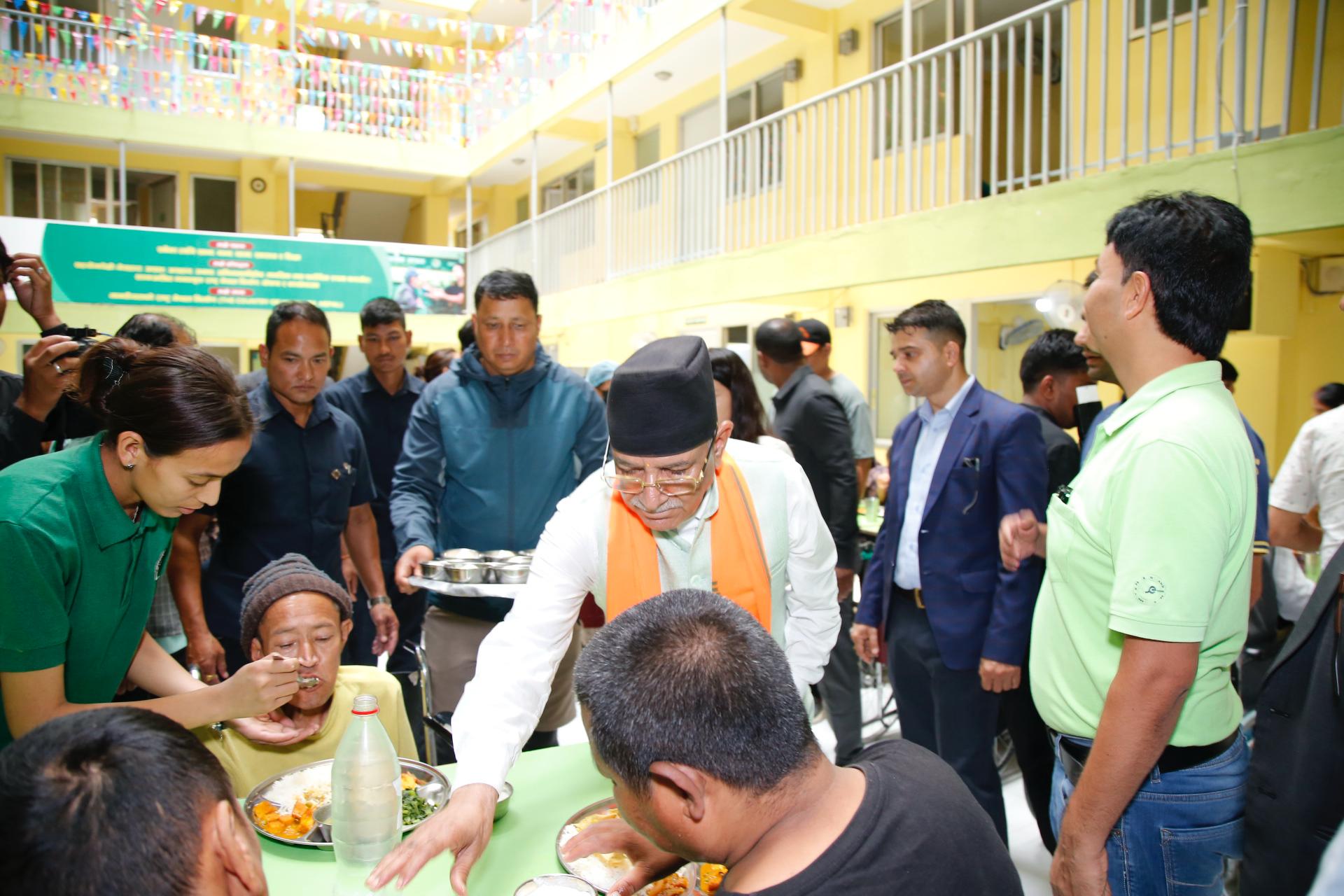 उनले आश्रममा आश्रित महानुभावहरूसँग आत्मीय भेटघाट गर्नुका साथै भोजन गराउनु भयो र उनि स्वयं पनि उनिहरूसँगै बसेर खाना खाए । उनले आफू प्रधानमन्त्री भएको बेला हेटौंडामा मानव सेवा आश्रमको केन्द्रीय भवन उद्घाटन गरेको स्मरण गर्दै, मानव उद्धारका लागि आवश्यक सवारी साधनको व्यवस्थापनमा सहजीकरण गर्ने प्रतिबद्धता जनाए । साथै, मानव सेवा आश्रमले सकारात्मक उदेश्यले देशभर सञ्चालन गरेका काममा साथ र सहयोग पु-याउने बताए ।