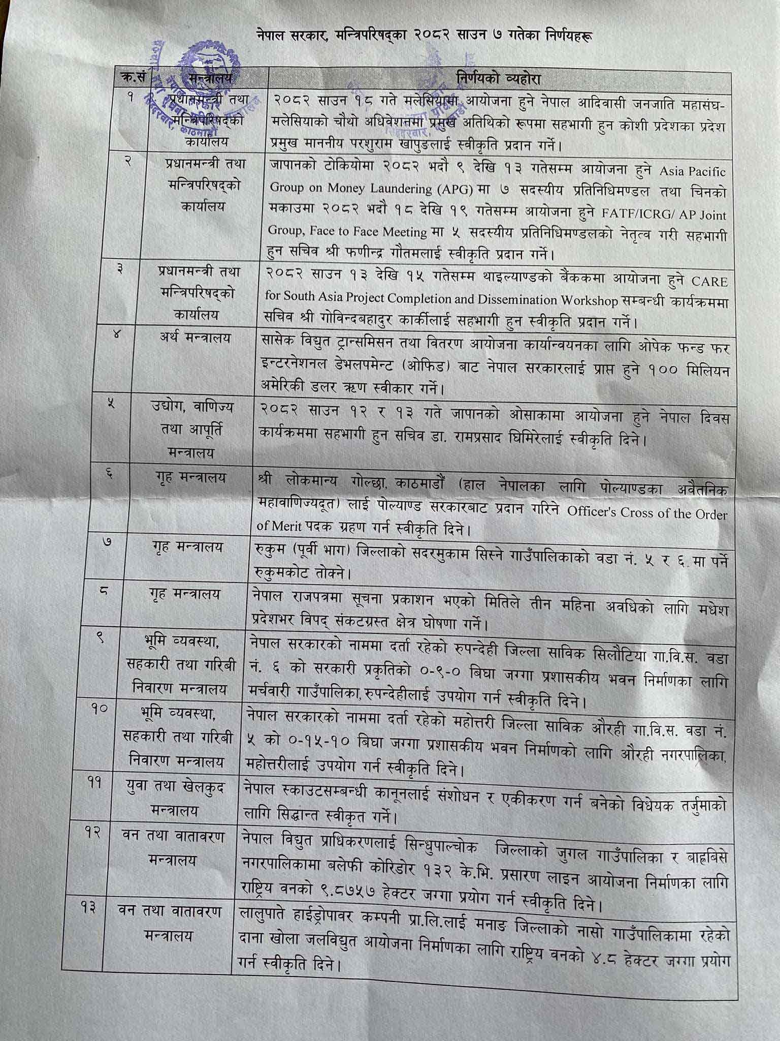 काठमाडौं । मन्त्रिपरिषद् बैठकका १३ वटा निर्णय सार्वजनिक भएका छन् । सरकारका प्रवक्ता एवम् सञ्चार तथा सूचना प्रविधि मन्त्री पृथ्वी सुब्बा गुरुङले नियमित पत्रकार सम्मेलन गर्दै साउन ७ गते बसेको मन्त्रिपरिषद् बैठकका १३ वटा निर्णय बिहीबार सार्वजनिक गरेका छन् ।