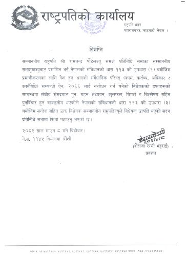 सो संशोधन संविधानको मर्म र भावना तथा लोकतान्त्रिक मूल्य, मान्यता र विश्वव्यापी अभ्यास प्रतिकूल भएकाले संविधानको धारा ११३ को उपधारा (३) बमोजिम पुनर्विचारका लागि विधेयक उत्पत्ति भएको प्रतिनिधिसभामा बिहिबार फिर्ता पठाइएकाे राष्ट्रपतिका प्रेस सल्लाहकार किरण पोखरेलले जानकारी दिए ।