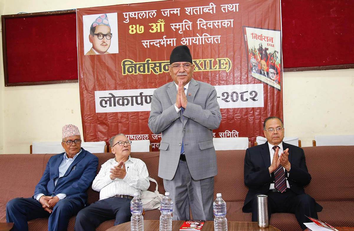 सो अवसरमा अध्यक्ष दाहाल र नेपाल कम्युनिष्ट पार्टी एकीकृत समाजवादीका सम्मानित नेता खनाललगायतले लेखक लोककृष्ण भट्टराईको पुस्तक ‘निर्वासन’ लोकार्पण गरेको थिए। पुस्तकमाथि टिप्पणी गर्दै एमाले नेता कैलाश ढुङ्गेलले पुष्पलालको सम्पूर्ण जीवनचक्र पुस्तकमा समेटिएको बताए ।