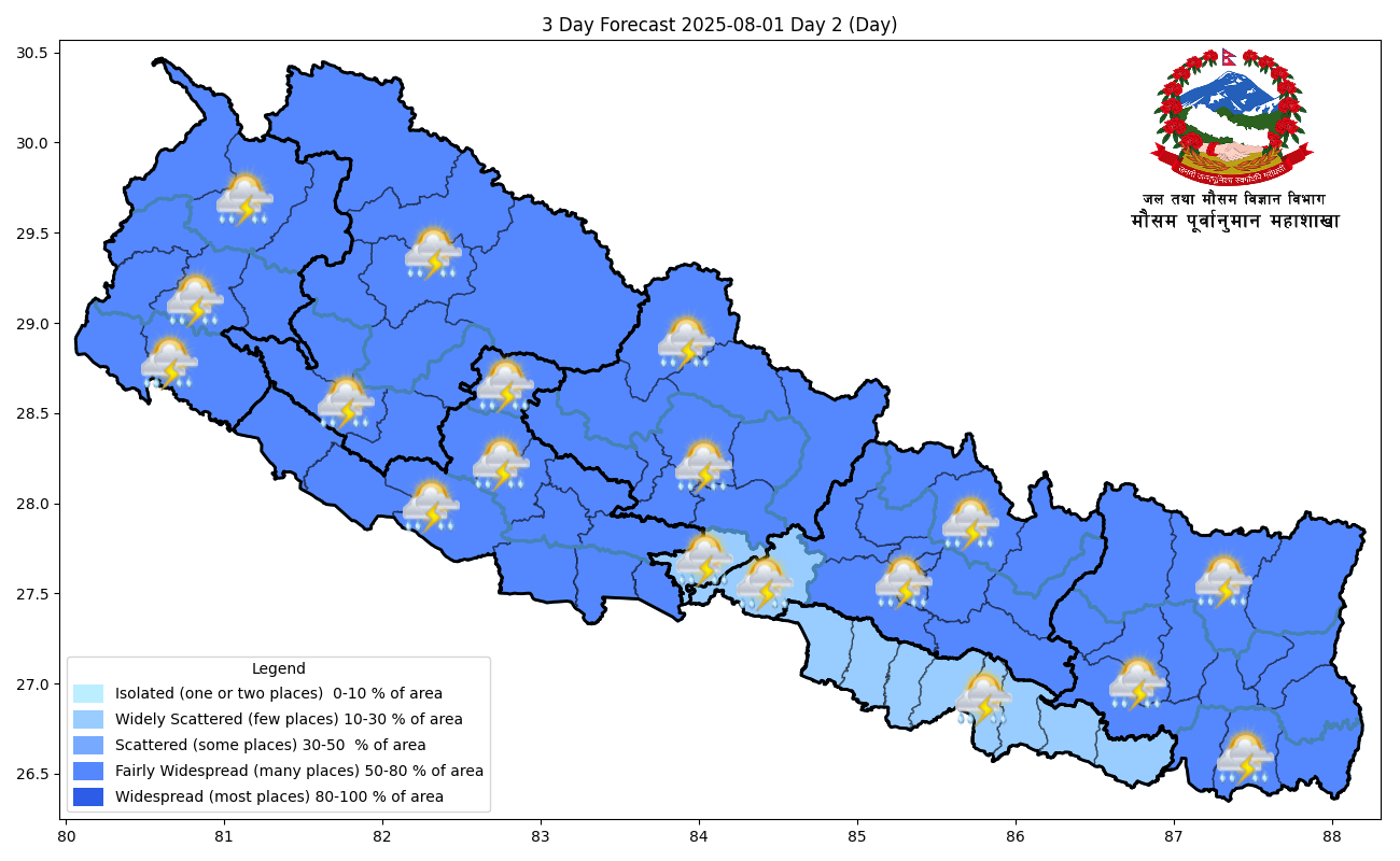 महाशाखाका अनुसार आज दिउँसो कोशी, लुम्बिनी, कर्णाली र सुदूरपश्चिम प्रदेशका पहाडी भागका धेरै तथा तराई भेगका केही स्थानमा मेघगर्जन र चट्याङसहित मध्यम वर्षाको सम्भावना छ ।