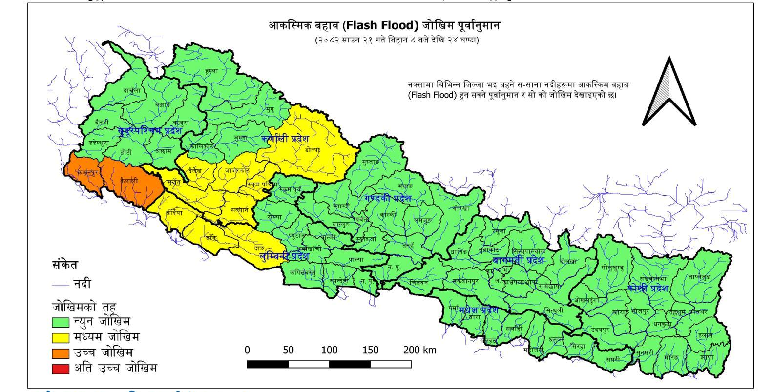 महाशाखाका अनुसार कैलाली र कञ्चनपुर जिल्लाका नदीहरूमा आकस्मिक बाढीको उच्च जोखिम रहेकाले यी दुई जिल्लालाई रेड अलर्टमा राखिएको छ। यता दाङ, बाँके, बर्दिया, जाजरकोट, डोल्पा, रुकुम-पश्चिम, सल्यान, सुर्खेत, दैलेख लगायतका जिल्लामा पनि साना नदीमा बहाव बढ्ने र मध्यमदेखि उच्च जोखिम रहेको उल्लेख छ। यी जिल्लामा येलो अलर्ट जारी गरिएको छ।