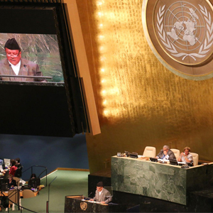 संयुक्त राष्ट्र सङ्घको ७० औँ महासभाअन्तर्गतको सन् २०१५ पछिका विकासका विषय अनुमोदन गर्न शुक्रबार यहाँ आयोजना गरिएको सम्मेलनलाई सम्बोधन गर्दै उपप्रधानमन्त्री प्रकाशमान सिंह । तस्बिरः सूर्यचन्द्र बस्नेत/रासस \"prakashaman_rastasangha\"