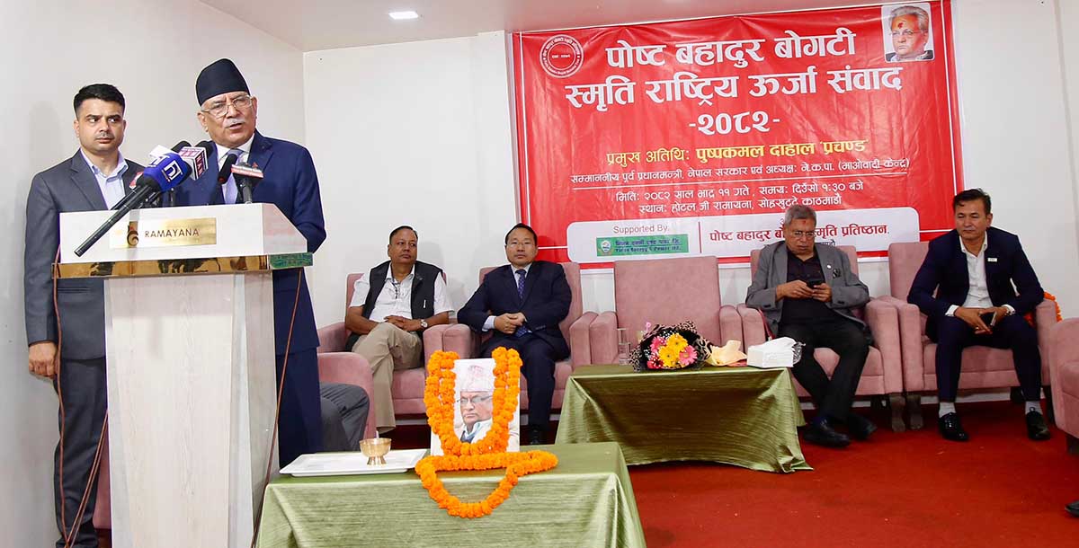 पोस्टबहादुर बोगटी स्मृति प्रतिष्ठानद्वारा आयोजित “नेपालको ऊर्जा राज्यशिल्प र जलविद्युत् परिदृश्य: रणनीतिक प्राथमिकता, चुनौती र सम्भावना” विषयक राष्ट्रिय ऊर्जा संवादलाई सम्बोधन गर्दै अध्यक्ष प्रचण्डले ऊर्जा र कृषिलाई गणतन्त्रको पहिलो सरकारले नै आधारभूत प्राथमिकता दिएको स्मरण गरे ।