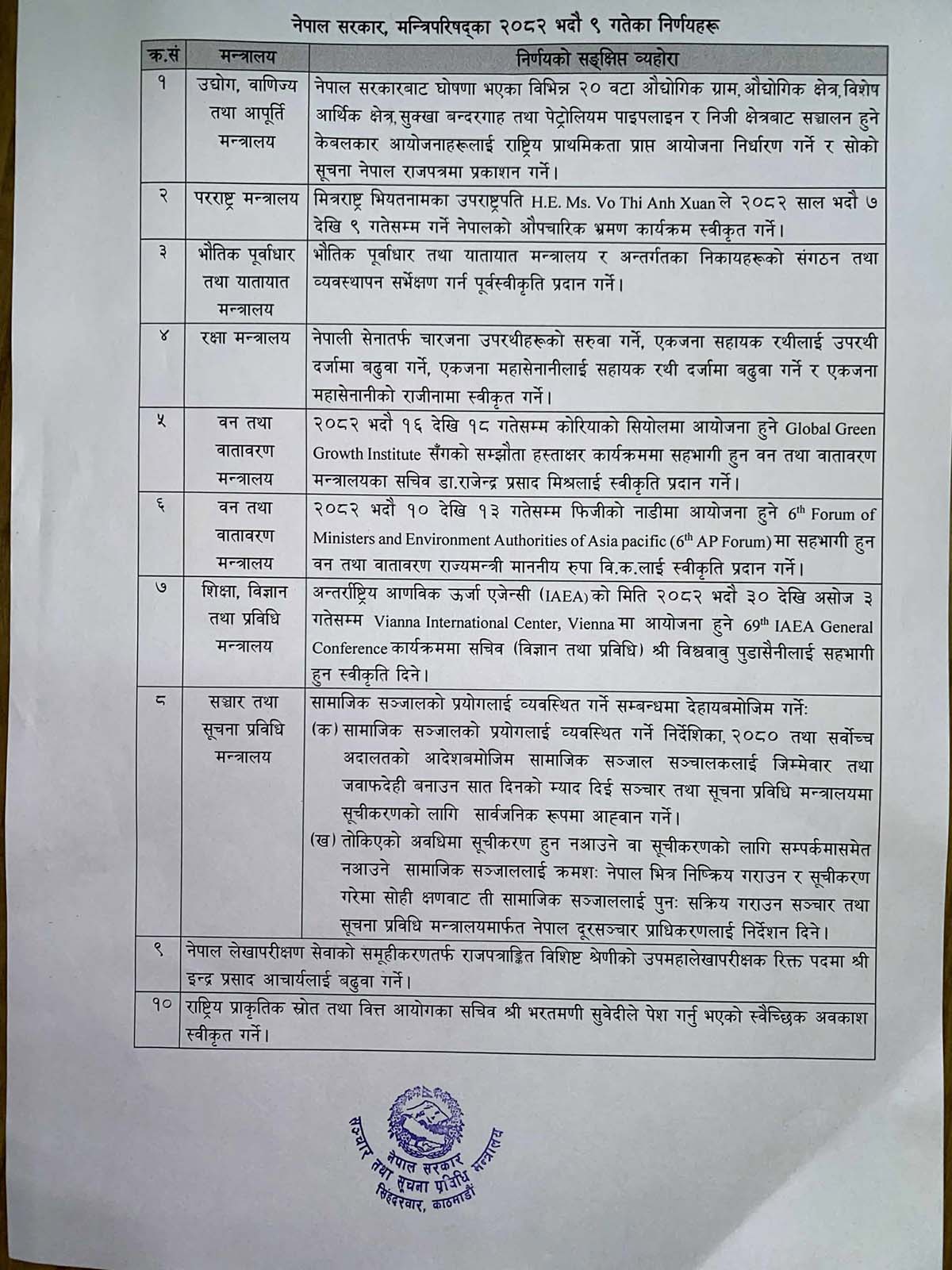 मन्त्रिपरिषद् बैठकका १० वटा निर्णय सार्वजनिक भएका छन् । नियमित पत्रकार सम्मेलन गर्दै उनले साउन भदौ ९ गते बसेको मन्त्रिपरिषद् बैठकका १० वटा निर्णय बुधबार सार्वजनिक गरेका हुन् ।
