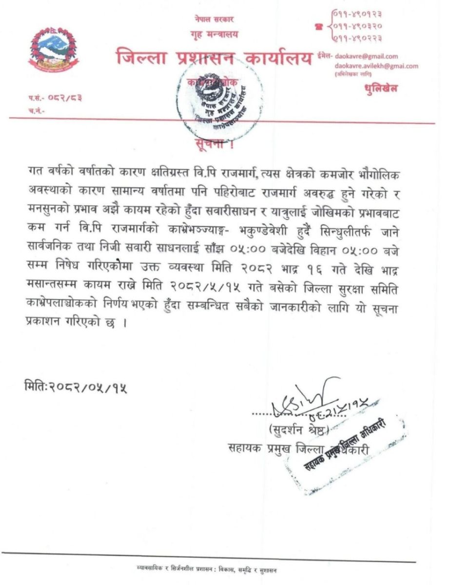 जिल्ला सुरक्षा समिति काभ्रेको आइतबारको बैठकले वीपी राजमार्गको काभ्रेभञ्ज्याङ–भकुण्डेवेशी हुँदै सिन्धुलीतर्फ जाने सार्वजनिक तथा निजी सवारी साधनलाई साँझ ५ बजेदेखि बिहान ५ बजेसम्म सञ्चालनमा रोक लगाउने निर्णय गरेको हो ।