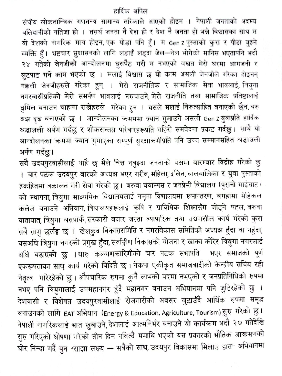 चाैधरीले विज्ञप्तिमा पुन: भनेका छन्, “अन्तमा जेनजी आन्दोलनको आवरणमा भएका आगजनी र लुटपाटको घटनाको छानवीन गरी त्यस्तो कार्यमा सलग्न सबैलाई पक्राउ गरी कानुनी राज्य र विधिको शासनको प्रत्याभूति गर्न नेपाल सरकारसँग माग गर्दछु । मेरो व्यक्तिगत सम्पति लुट्ने, आगजनी गर्ने सबैलाई पक्राउ गरी कानुनी कारवाहीको दायरामा ल्याउनको लागि आवश्यक कानुनी प्रकृया अघि बढाएको जानकारी पनि गराउन चाहान्छु ।”