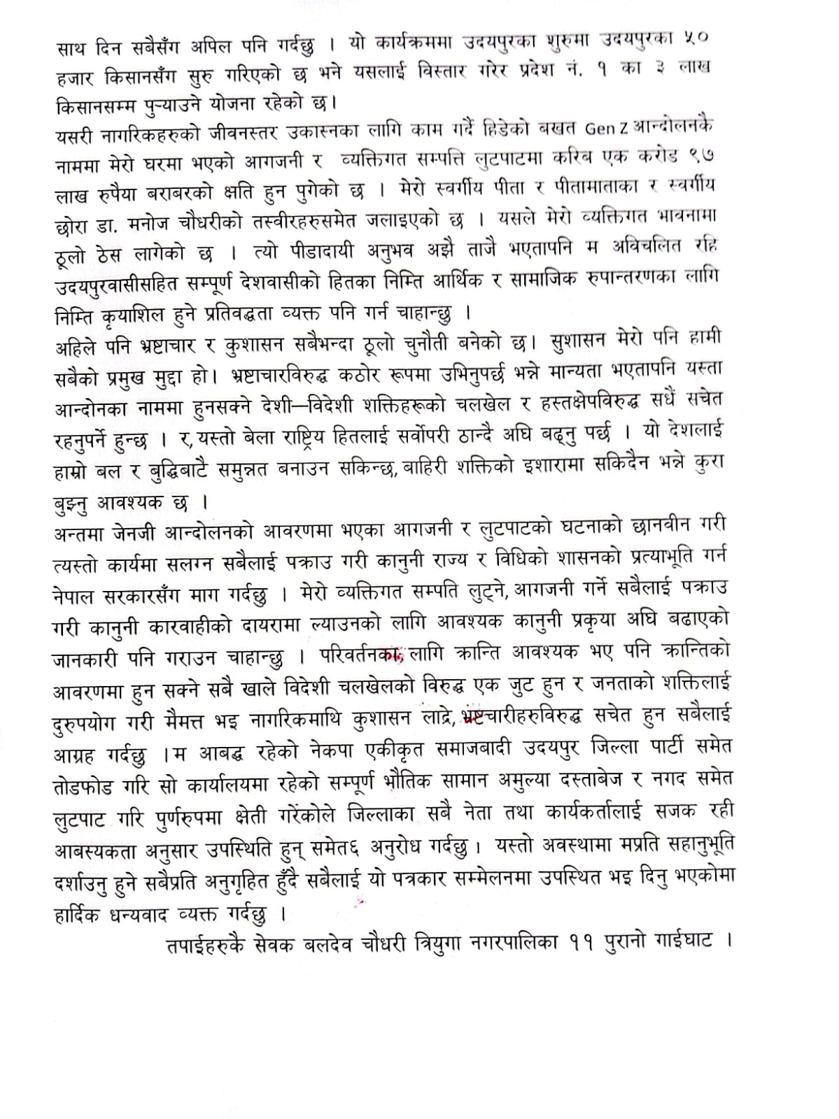 चाैधरीकाे विज्ञप्तिमा भनिएकाे छ-“नागरिकहरुको जीवनस्तर उकास्नका लागि काम गर्दै हिडेको बखत जेनजी आन्दोलनकै नाममा मेरो घरमा भएको आगजनी र व्यक्तिगत सम्पत्ति लुटपाटमा करिब एक करोड ९७ लाख रुपैया बराबरको क्षति हुन पुगेको छ । मेरो स्वर्गीय पीता र पीतामाताका र स्वर्गीय छोरा डा. मनोज चौधरीको तस्वीरहरुसमेत जलाइएको छ । यसले मेरो व्यक्तिगत भावनामा ठूलो ठेस लागेको छ ।”