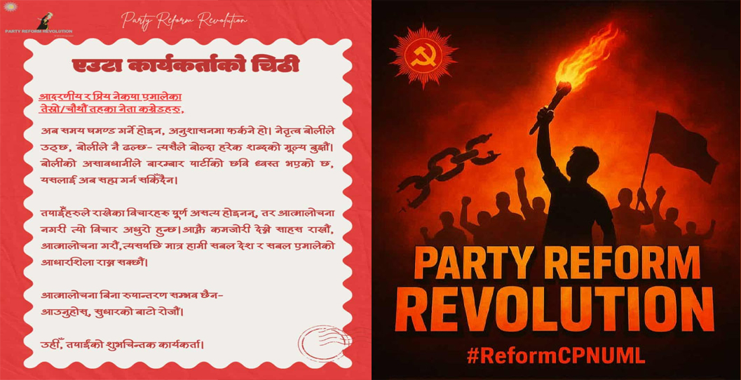 कैलाली । नेकपा एमालेका युवाहरूले पार्टीभित्रको विकृति, विसंगति र गुटगत स्वार्थविरुद्ध आवाज उठाउँदै नयाँ अभियानको थालनी गरेका छन् । ‘पार्टी रिफर्म रिभोल्युसन’ नाम दिइएको यो अभियानलाई उनीहरूले सुधार र पुनर्गठनको सुरुवातका रूपमा प्रस्तुत गरेका छन् ।