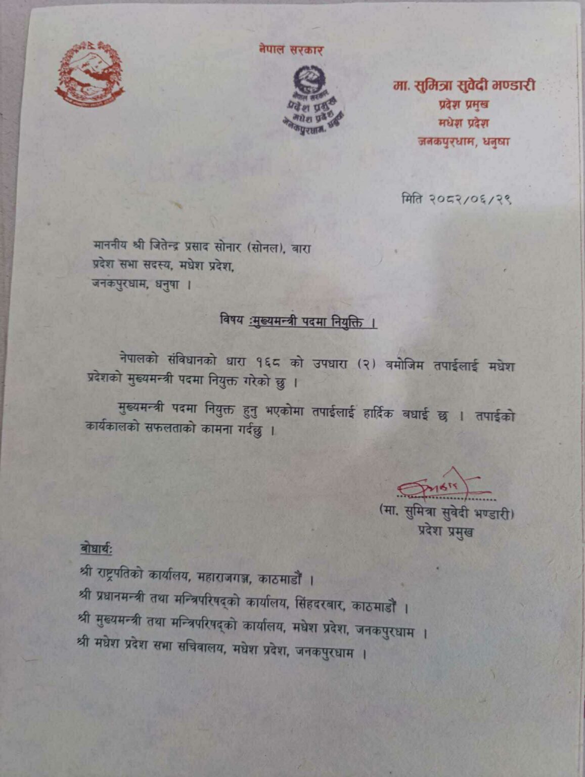 नेपाल संविधानको धारा १६८ को उपधारा (२) अनुसार बुधबार सोनारलाई मुख्यमन्त्रीमा नियुक्त गरिएको हो ।