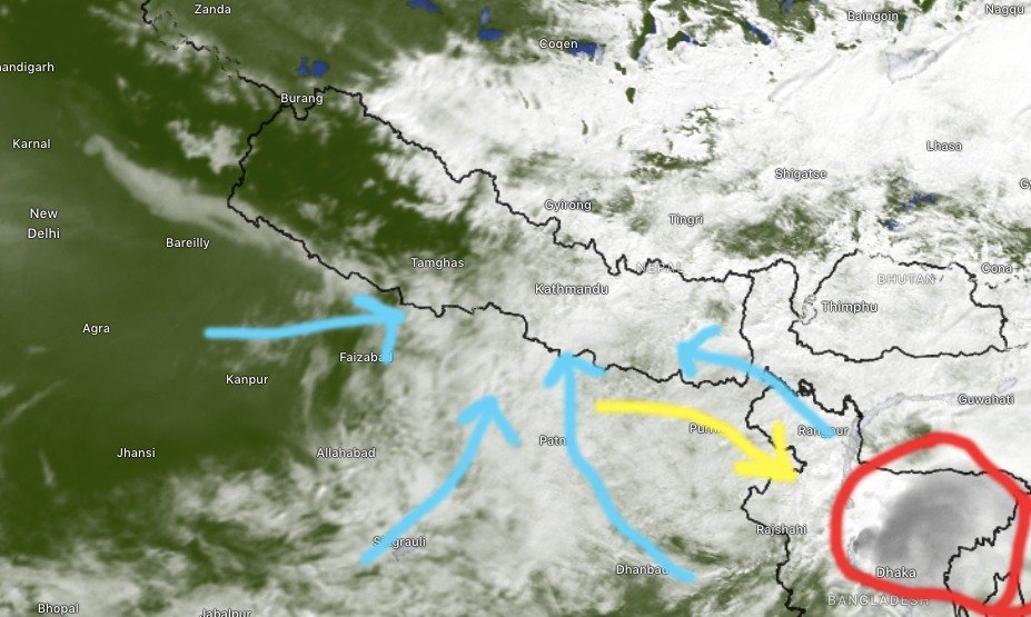 मौसमविद् उज्वल उपाध्यायका अनुसार, मोन्टा आँधी, पश्चिमी वायु र अरब सागरबाट आएको अर्को प्रणालीको मिश्रणले ठूलो संयुक्त प्रणाली बनेको छ, जसका कारण वर्षा लगातार भइरहेको छ।