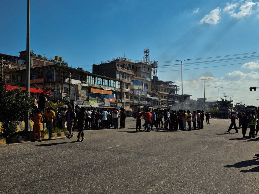 प्रदर्शनकारीले सडकमा टायर बालेर अवरोध सिर्जना गरेका छन्। प्रहरीले बारम्बार सडक खाली गर्न चेतावनी दिएको भए पनि प्रदर्शन जारी छ।