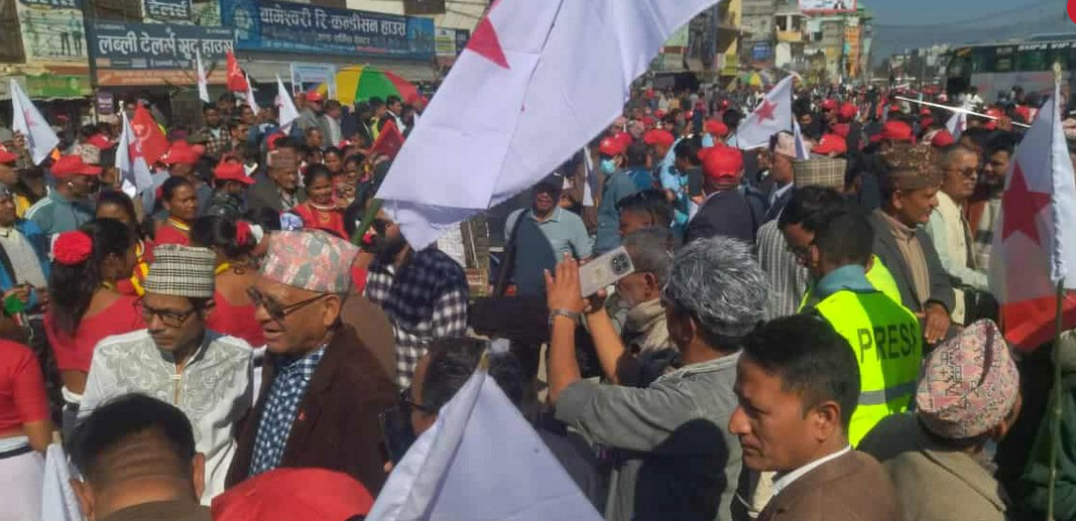 कैलाली । नेपाली कम्युनिस्ट पार्टी (नेकपा)ले आयोजना गरेको ‘एकता सन्देश’ जुलुस धनगढीमा सुरु भएको छ। धनगढीको चौराहाबाट सुरु भएको जुलुसमा पार्टीका नेता तथा कार्यकर्ताहरूको उल्लेखनीय उपस्थिति देखिएको छ। सहभागीहरूले विविध नारासहित जुलुसलाई अगाडि बढाएका छन्।