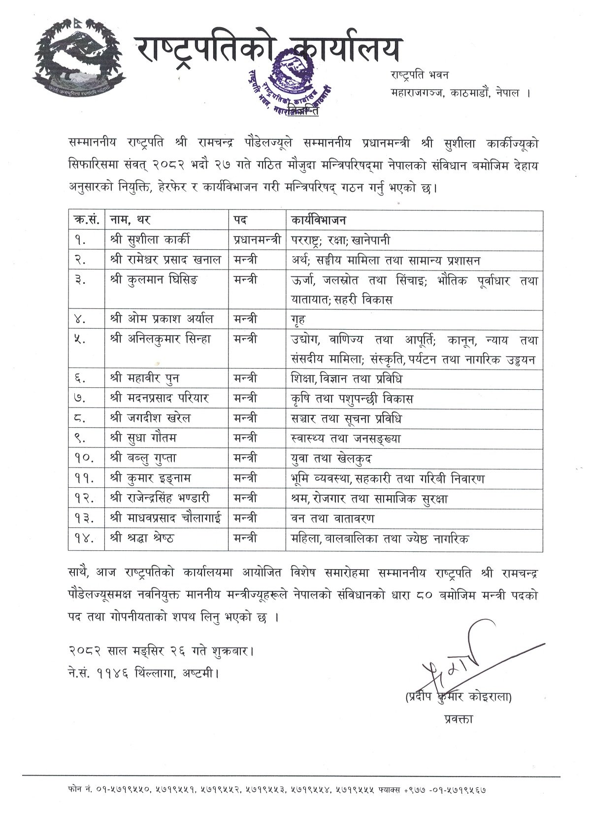 प्रधानमन्त्री कार्कीले कुमार इङ्नामलाई भूमि व्यवस्था मन्त्रालय, राजेन्द्रसिंह भण्डारीलाई श्रम मन्त्रालय, माधव चौलागाईंलाई वन मन्त्रालय तथा श्रद्धा श्रेष्ठलाई महिला मन्त्रालयको जिम्मेवारी दिएकी छन् । नयाँ मन्त्री थपिएसँगै प्रधानमन्त्री कार्की नेतृत्वको मन्त्रिपरिषद् १४ सदस्यीय भएको छ ।
