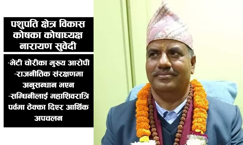 काठमाडौँ । आराध्यदेव भगवान पशुपतिनाथ मन्दिरभित्रै भेटी चोरी गर्ने गिरोहका मुख्य आरोपी पशुपति क्षेत्र विकास कोषका कोषाध्यक्ष नारायणप्रसाद सुवेदीको कार्यकाल सकिँदैछ। पूर्वप्रधानमन्त्री एवं नेपाली कम्युनिस्ट पार्टीका सहसंयोजक माधवकुमार नेपालको पहुँचका कारण भेटी चोरीको संरक्षककर्ता सुवेदीले अनुसन्धान नभइ उन्मुक्ति पाउने भएका हुन्।