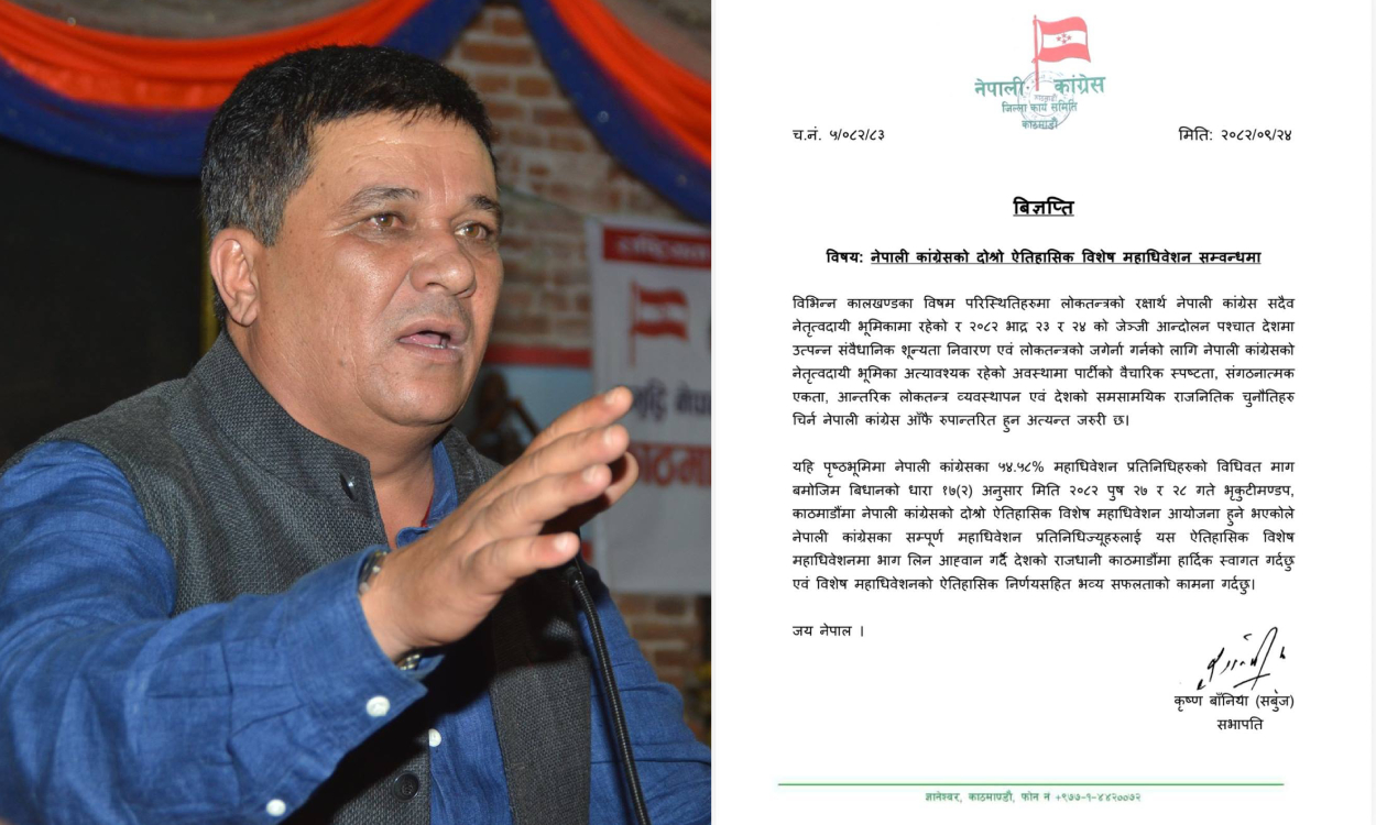 यसै सिलसिलामा, सभापति कृष्ण बानियाँ (सबुज) ले आगामी पुस २७–२८ मा हुने विशेष महाधिवेशनमा सबै प्रतिनिधि तथा कार्यकर्ताको उपस्थितिका लागि आह्वान गरेका छन्।