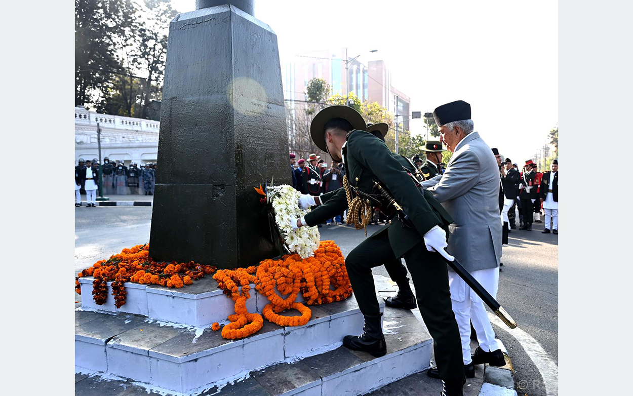 सिंहदरबारको पश्चिमद्वार नजिक रहेको राष्ट्र निर्माताको सालिकमा पुष्पहार अर्पण गरी उनको योगदानको सम्मान गरेको हो। त्यस अवसरमा नेपाली सेनाको एक टुकडीले राष्ट्रपतिप्रति सलामी अर्पण गरेको थियो ।
