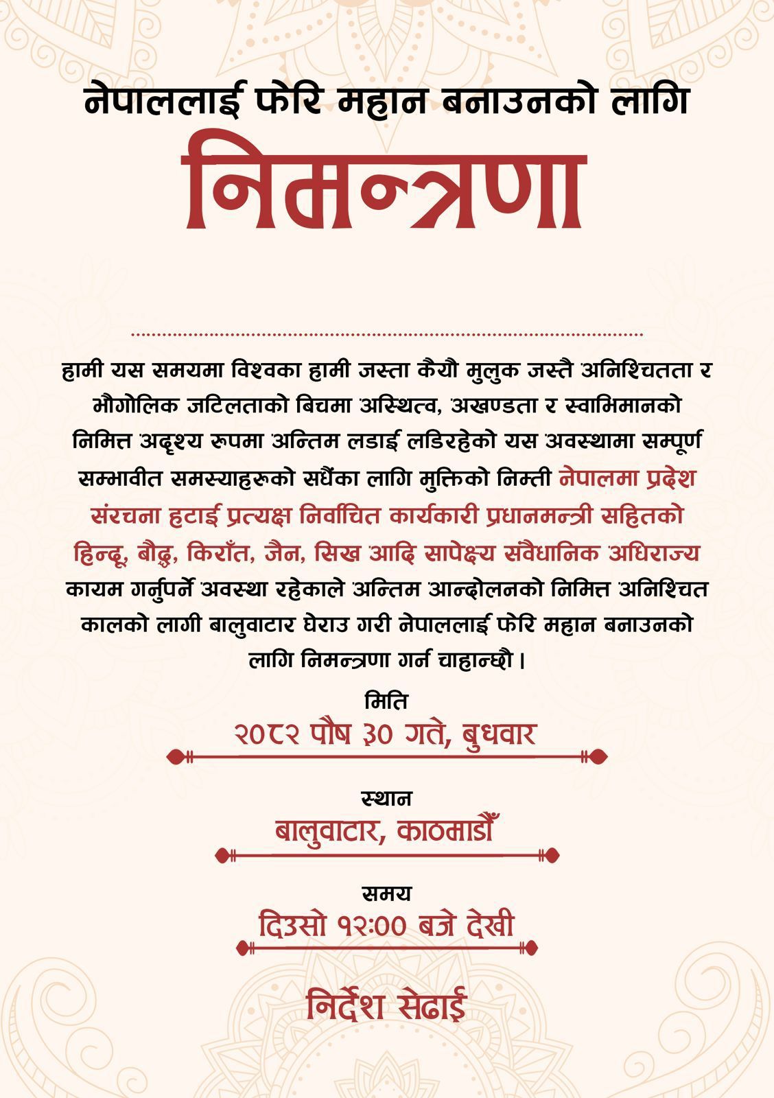 आयोजक निर्देश सेढाईले जारी गरेको आह्वान अनुसार मुलुक हाल विश्वका धेरै राष्ट्रहरूजस्तै गम्भीर अनिश्चितता, भौगोलिक संवेदनशीलता र आन्तरिक अस्थिरताबीच आफ्नो अस्तित्व, अखण्डता र स्वाभिमान जोगाउन अदृश्य रूपमा अन्तिम लडाइँको आवश्यकता रहेको बताएका छन। उनले वर्तमान राज्य संरचनाले जनअपेक्षा पूरा गर्न नसकेको, आर्थिक बोझ बढाएको तथा प्रशासनिक जटिलता सिर्जना गरेको दाबी गरे।