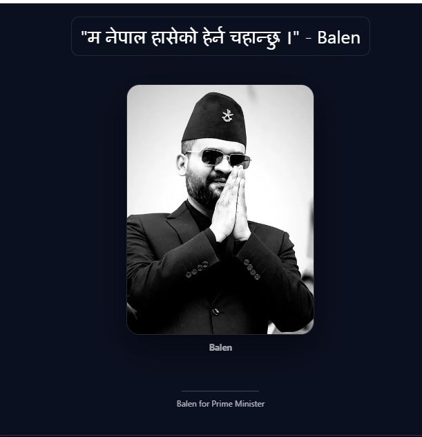 वेबसाइटको होम पेजमा बालेनको तस्बिरका साथै ‘म नेपाल हाँसेको हेर्न चाहन्छु 'बालेन’ भन्ने नारा राखिएको छ ।