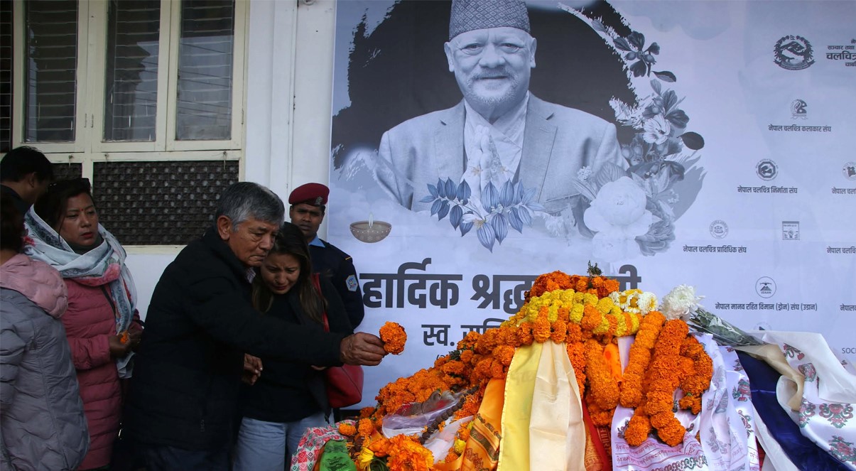 काठमाडौं । अभिनेता सुनिल थापालाई आइतबार चलचित्रकर्मी, संगीतकर्मी र शुभेच्छुकहरूले अन्तिम श्रद्धाञ्जली दिएका छन्। उनका पार्थिव शरीरलाई दिउँसो चलचित्र विकास बोर्डमा राखेर श्रद्धाञ्जली कार्यक्रम आयोजना गरिएको थियो।