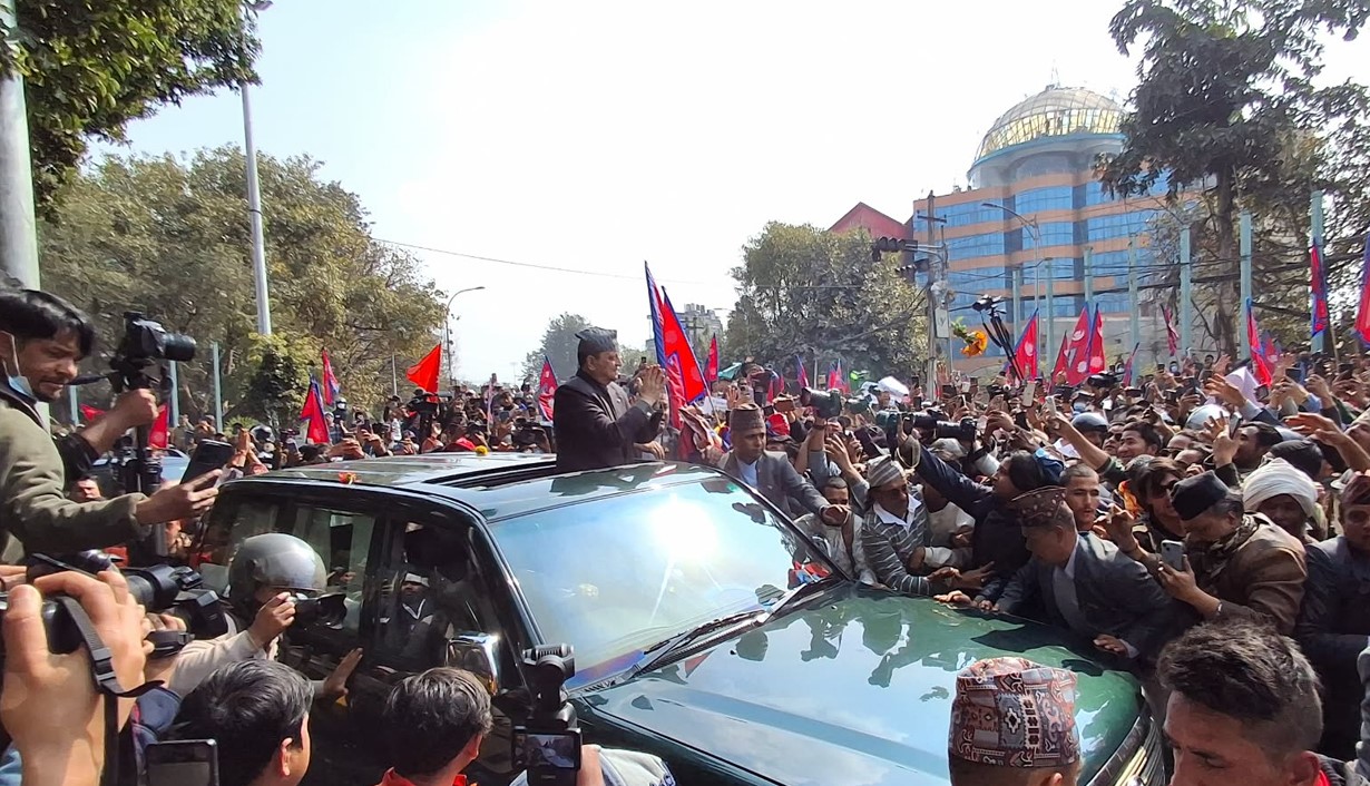 विमानस्थलमा उनका समर्थनमा बाक्लो संख्यामा समर्थकहरू भेला भएका छन् र र्यालीसहित उनलाई निर्मल निवास पुर्याउने तयारी गरिएको छ। समर्थकहरूले ‘हाम्रो राजा हाम्रो देश, राजा आउ देश बचाऊ’ लगायतका नारा लगाइरहेका छन्।
